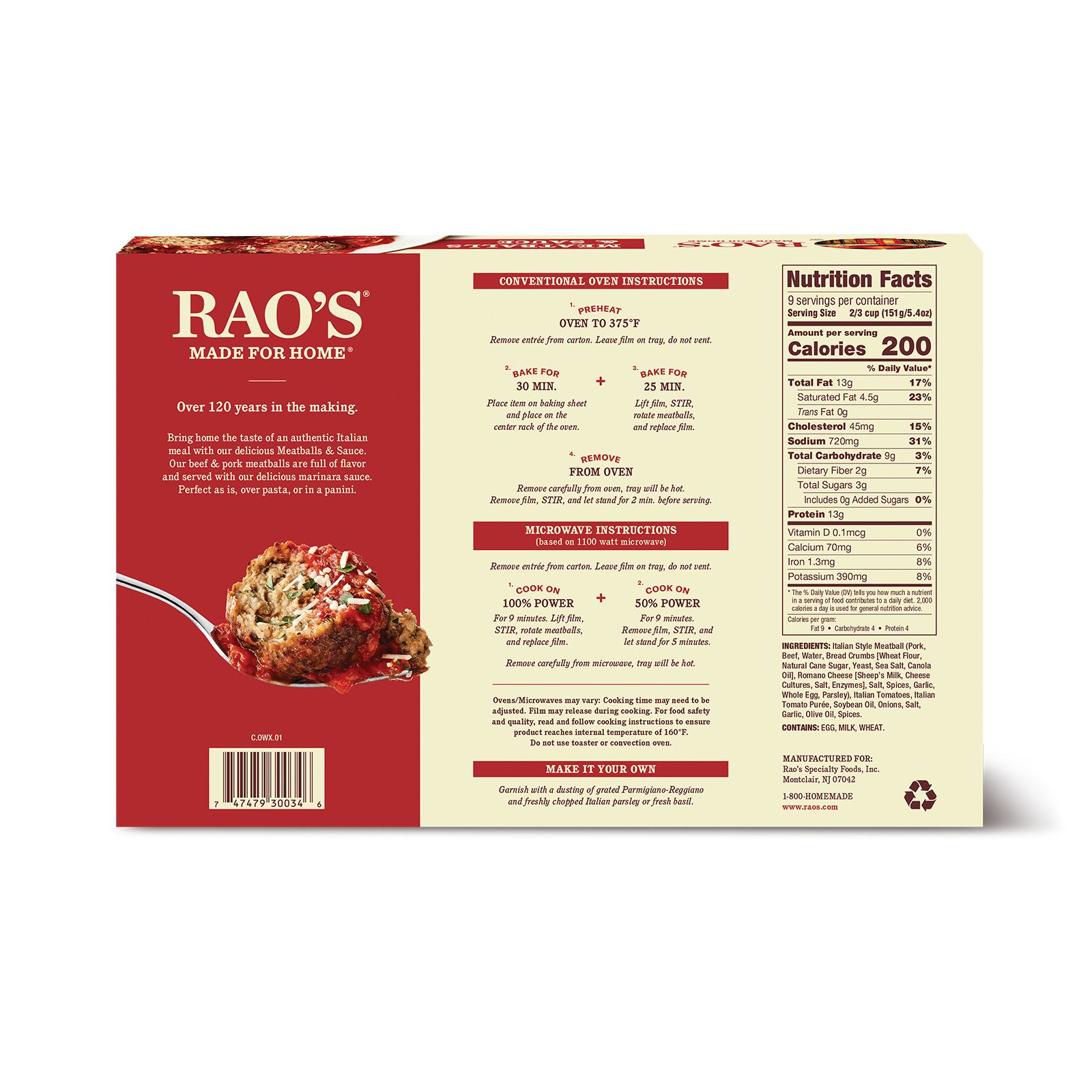 Bring home the taste of Rao's mouthwatering Meatballs & Sauce. Moist on the inside, crispy on the outside, these beef and pork meatballs are mixed with a delicious marinara sauce. Perfect as is, over pasta, or in a panini.