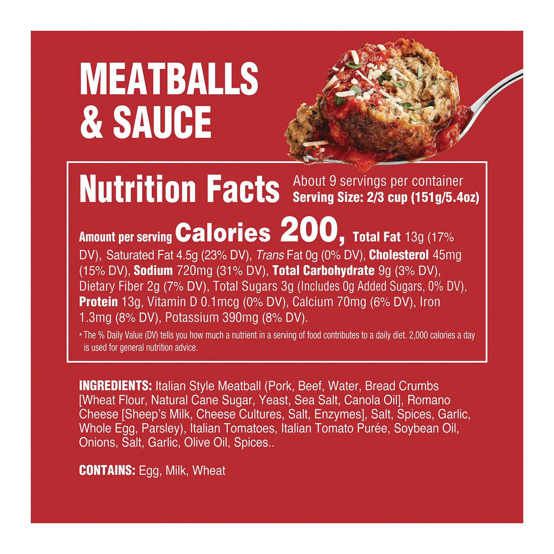 Ingredients: Meatballs (Pork, Beef, Water, Breadcrumbs [Wheat Flour, Cane Sugar, Yeast, Sea Salt, Canola Oil], Romano Cheese [Sheep’s Milk, Cheese Cultures, Salt and Rennet], Whole Egg, Parsley, Salt, Garlic, Spices), Italian Whole Peeled Tomatoes (Tomatoes, Salt, Basil Leaf),Olive Oil, Onions, Salt, Garlic, Spices. Contains: Milk, Eggs, Wheat.