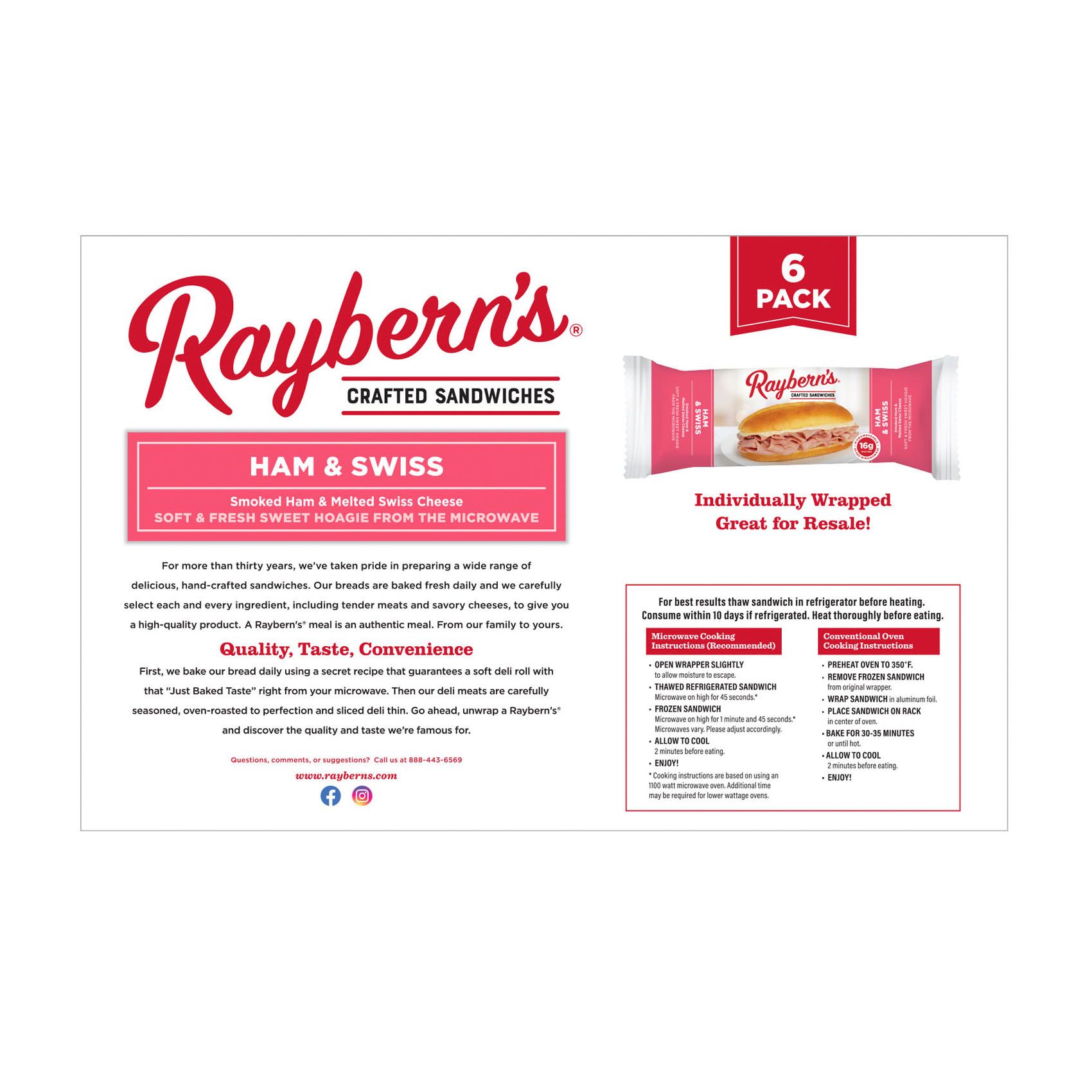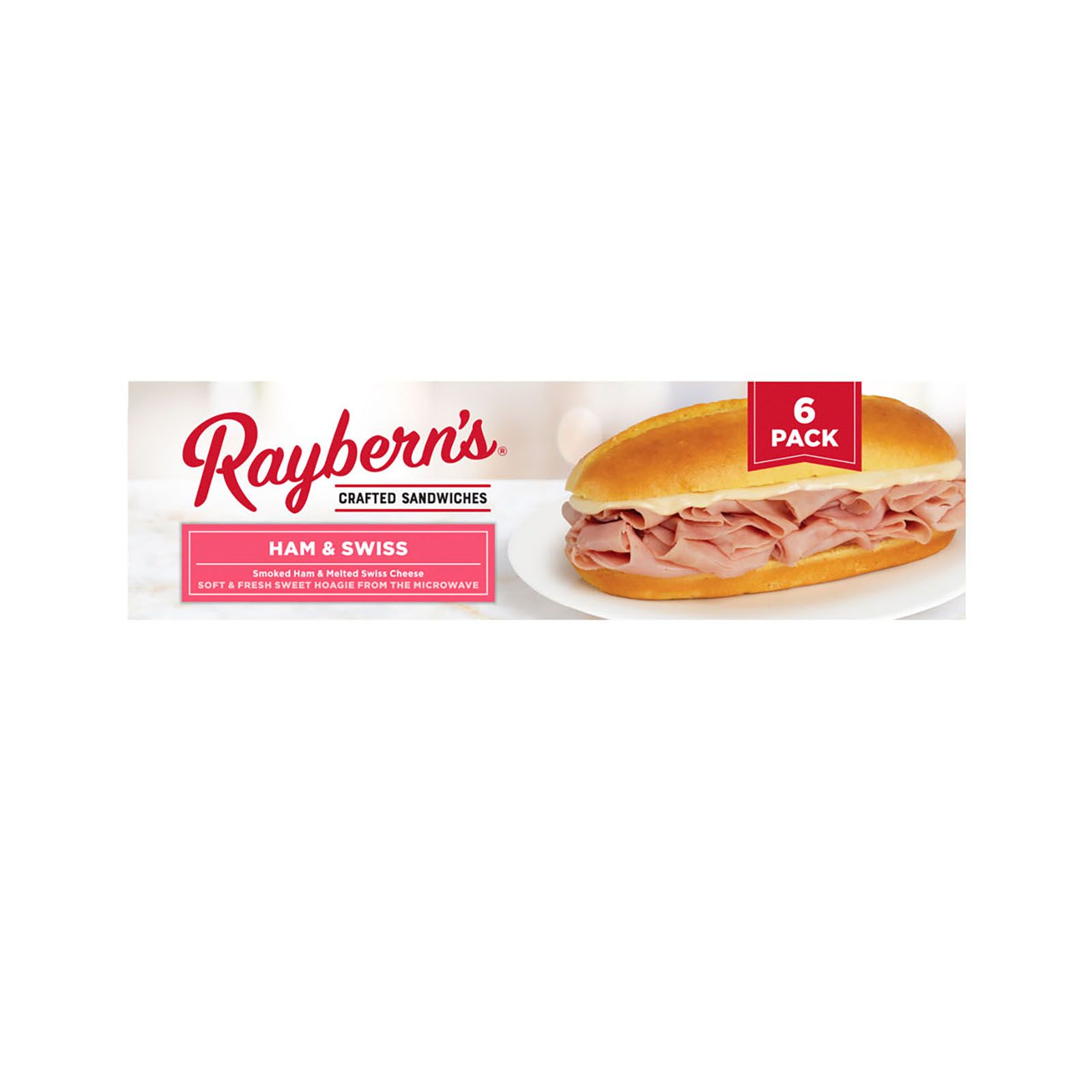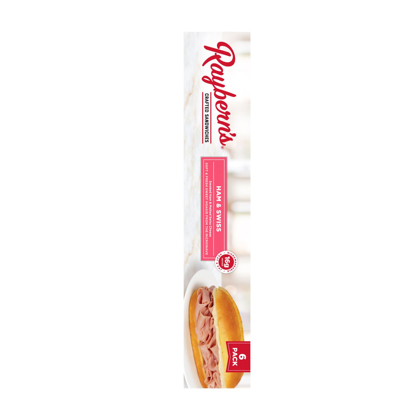 For more than thirty years, Raybern's has taken pride in preparing a wide range of delicious, hand-crafted sandwiches. Their breads are baked fresh daily and they carefully select each and every ingredient, including tender meats and savory cheeses, to give you a high-quality product. This Ham & Swiss sandwich is made with delightful, thinly sliced smoked ham paired with gooey melted Swiss cheese all on a sweet deli roll that cooks up "bakery-soft" right out of the microwave. These wrapped sandwiches can be ready to eat in under 90 seconds which makes them the perfect snack.