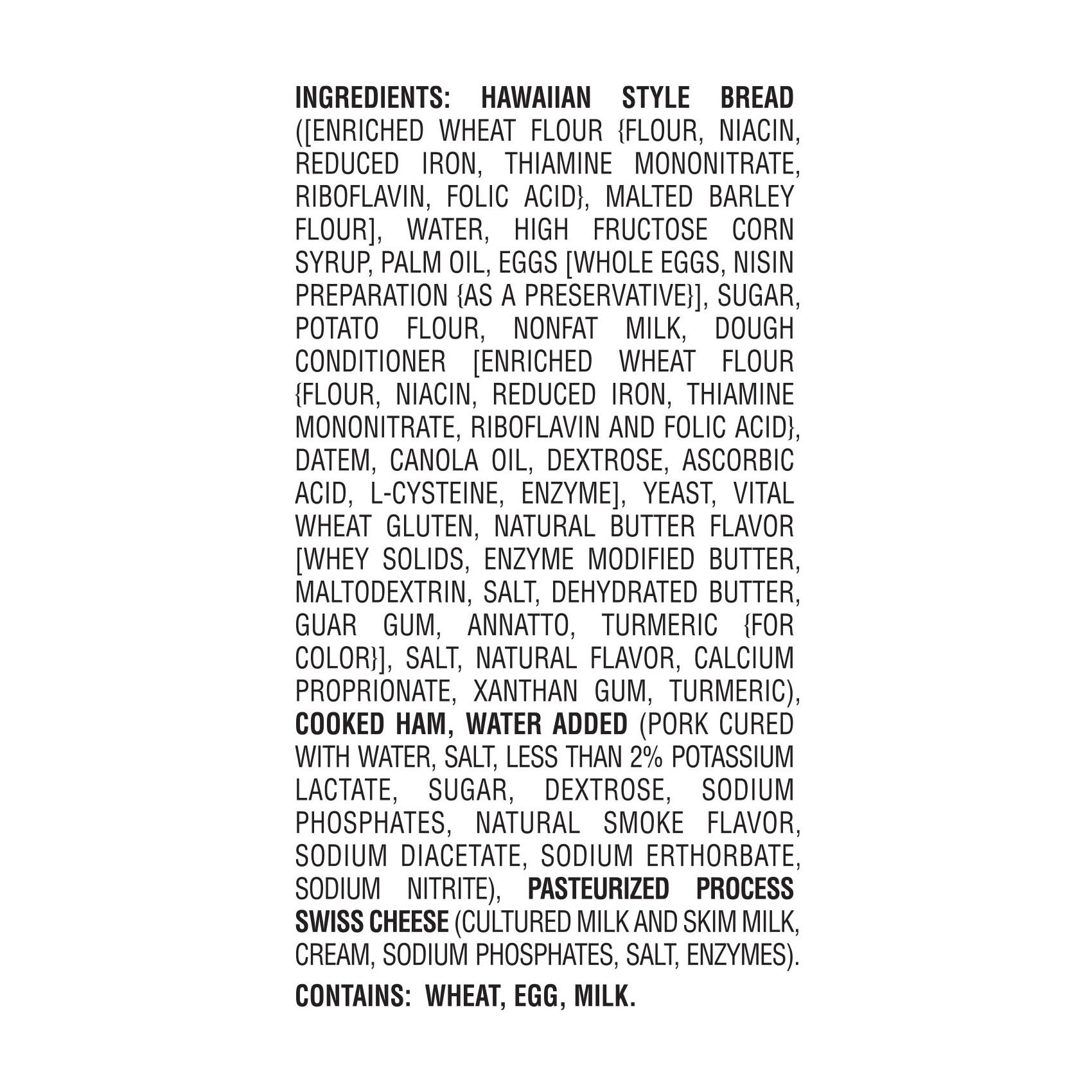 Ingredients: Sweet Hoagie ([Enriched Wheat Flour {Flour, Niacin, Reduced Iron, Thiamine Mononitrate, Riboflavin, Folic Acid}, Malted Barley Flour], Water, High Fructose Corn Syrup, Palm Oil, Eggs [Whole Eggs, Nisin Preparation {As A Preservative}], Sugar, Potato Flour, Nonfat Dry Milk, Dough Conditioner [Enriched Wheat Flour Flour, Niacin, Reduced Iron, Thiamine Mononitrate, Riboflavin And Folic Acid}, Datem, Canola Oil, Dextrose, Ascorbic Acid, L-cysteine, Enzyme], Yeast, Vital Wheat Gluten, Natural Butter Flavor [Whey Solids, Enzyme Modified Butter, Maltodextrin, Salt, Dehydrated Butter, Guar Gum, Annatto, Turmeric {For Color}], Salt, Natural Flavor, Calcium Proprionate [A Mold Inhibitor], Xanthan Gum, Turmeric), Cooked Ham, Water Added (Pork Cured With Water, Salt, Less Than 2% Potassium Lactate, Sugar, Dextrose, Sodium Phosphates, Natural Smoke Flavor, Sodium Diacetate, Sodium Erthorbate, Sodium Nitrite), Pasteurized Process Swiss Cheese (Cultured Milk And Skim Milk, Cream, Sodium Phosphates, Salt Enzymes).