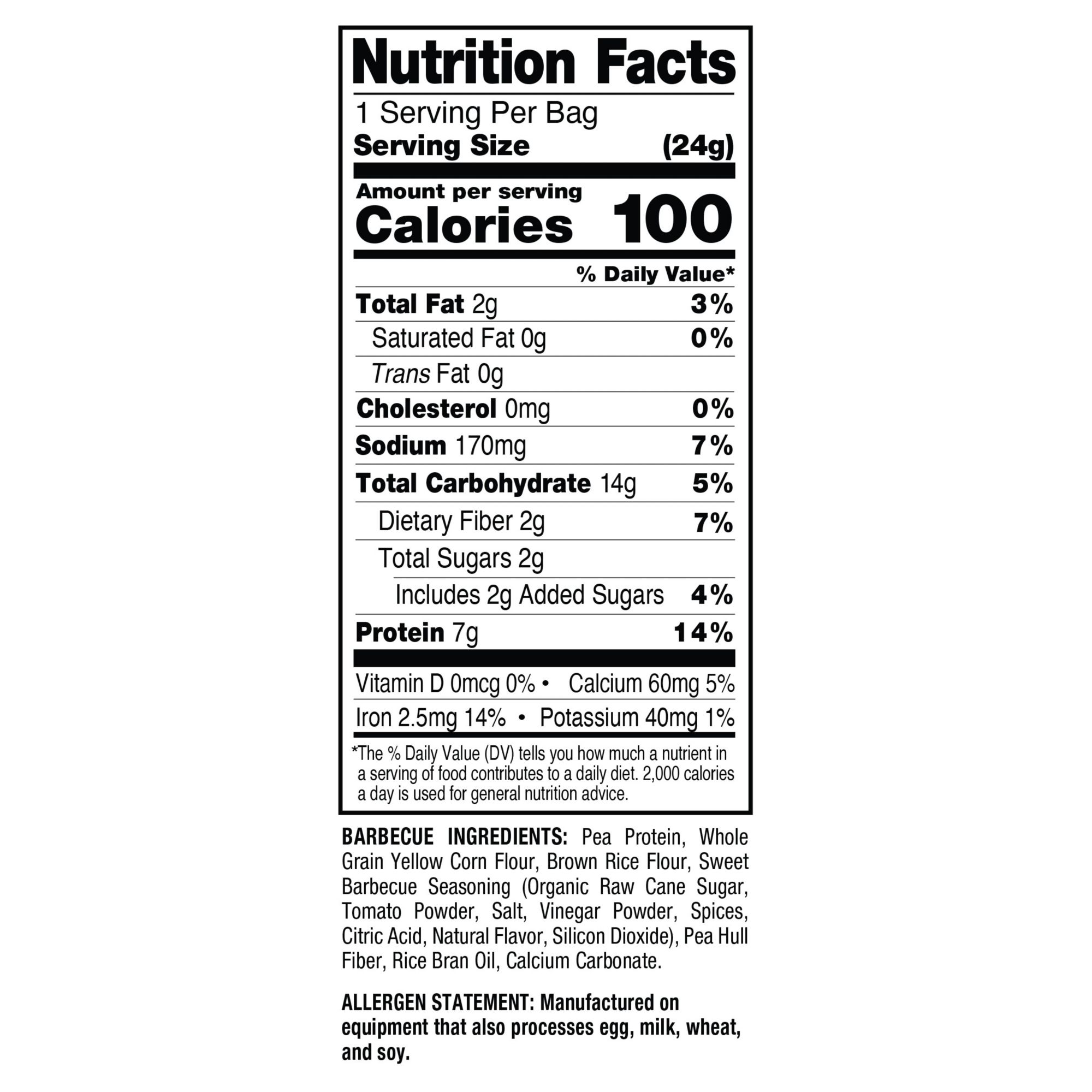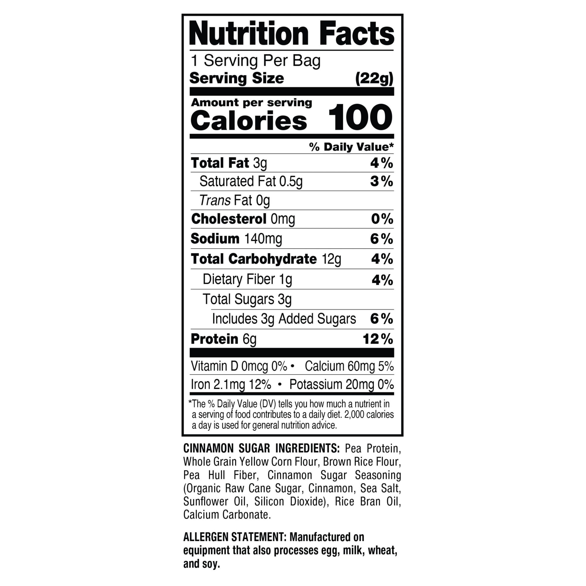 Ingredients: Barbecue: Pea Protein, Whole Grain Yellow Corn Flour, Brown Rice Flour, Sweet Barbecue Seasoning (Organic Raw Cane Sugar, Tomato Powder, Salt, Vinegar Powder, Spices, Citric Acid, Natural Flavor, Silicon Dioxide), Pea Hull Fiber, Rice Bran Oil, Calcium Carbonate Chipotle: Pea Protein, Whole Grain Yellow Corn Flour, Brown Rice Flour, Chipotle Seasoning (Maltodextrin, Organic Raw Cane Sugar, Salt, Spices, Citric Acid, Natural Flavor, Sunflower Oil, Silicon Dioxide), Rice Bran Oil, Pea Hull Fiber, Calcium Carbonate Cinnamon Sugar: Pea Protein, Whole Grain Yellow Corn Flour, Brown Rice Flour, Pea Hull Fiber, Cinnamon Sugar Seasoning (Organic Raw Cane Sugar, Cinnamon, Sea Salt, Sunflower Oil, Silicon Dioxide), Rice Bran Oil, Calcium Carbonate. Pink Himalayan Sea Salt: Pea Protein, Whole Grain Yellow Corn Flour, Brown Rice Flour, Rice Bran Oil, Pea Hull Fiber, Himalayan Salty Caramel Seasoning (Organic Raw Cane Sugar, Natural Flavor, Himalayan Salt, Caramelized Sugar), Calcium Carbonate