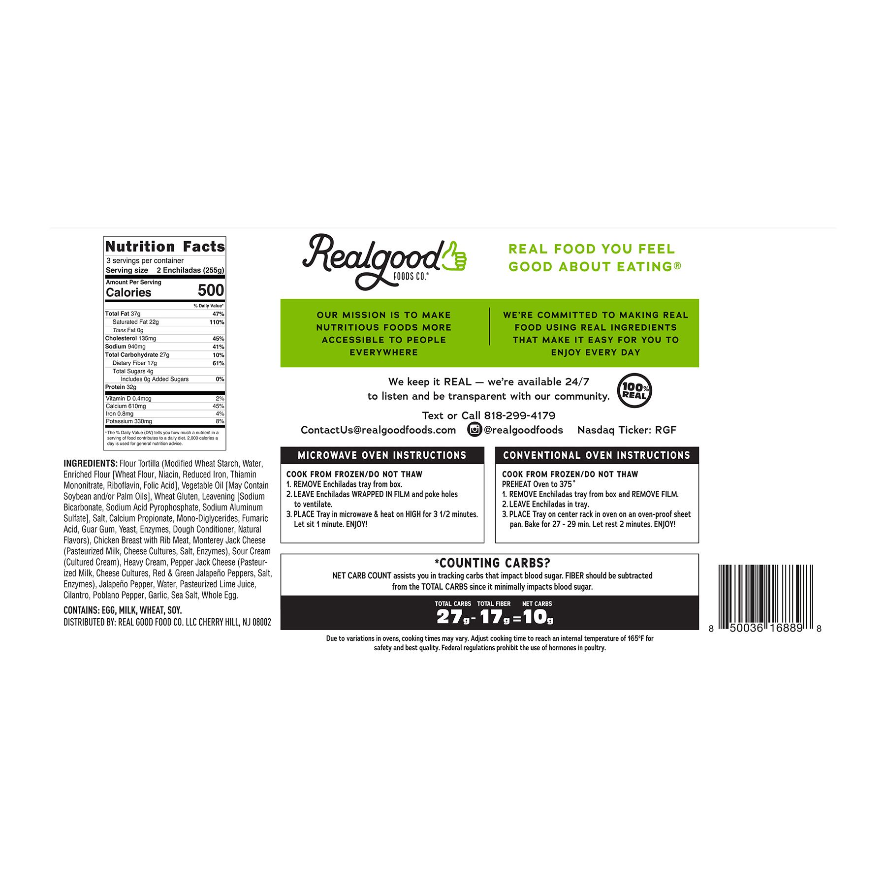 Real Good Foods delicious, authentic enchiladas are loaded with chicken breast chunks and Monterey Jack Cheese, smothered with Creamy Poblano Sauce, and wrapped in a new low carb flour tortilla. Each serving of two enchiladas has only 10g net carbs and is packed with 32g of protein. Cook a tray in as little as five minutes for a tasty and convenient meal. Top with lettuce, sour cream, avocado, salsa, or hot sauce. Available in three two-packs so you can use as meal prep or serve up a nutritious family-style dinner!