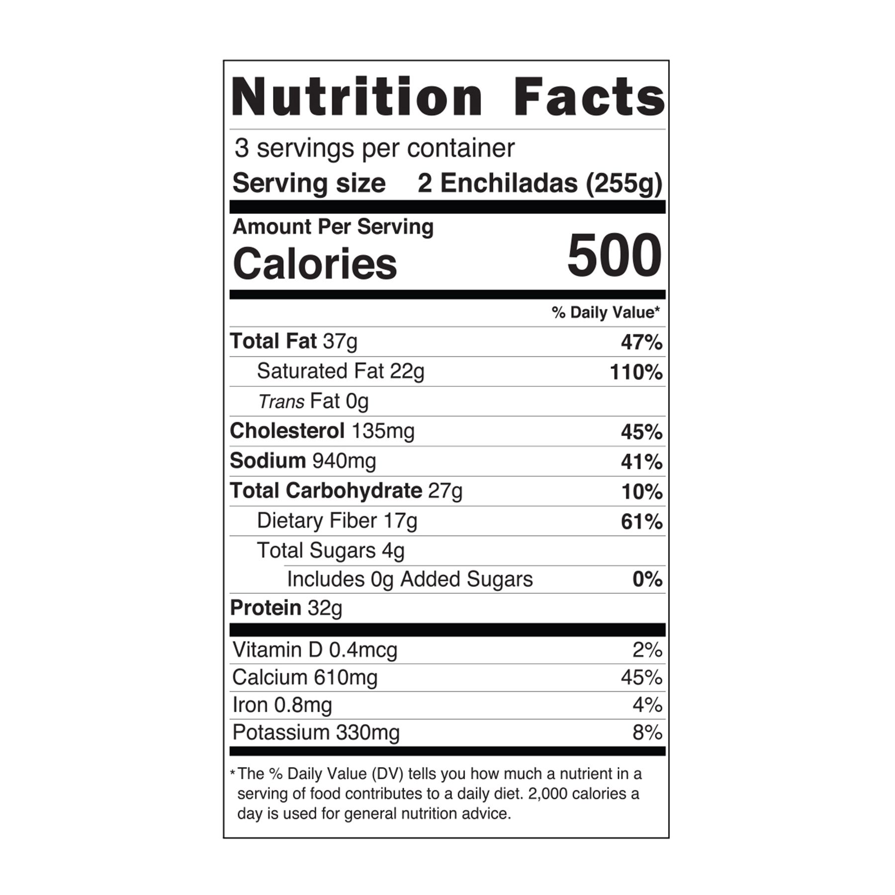 Ingredients: Flour Tortilla (Modified Wheat Starch, Water, Enriched Flour [Wheat Flour, Niacin, Reduced Iron, Thiamin Mononitrate, Riboflavin, Folic Acid], Vegetable Oil [May Contain Soybean and/or Palm Oils], Wheat Gluten, Leavening [Sodium Bicarbonate, Sodium Acid Pyrophosphate, Sodium Aluminum Sulfate], Salt, Calcium Propionate, Mono-Diglycerides, Fumaric Acid, Guar Gum, Yeast, Enzymes, Dough Conditioner, Natural Flavors), Chicken Breast with Rib Meat, Monterey Jack Cheese (Pasteurized Milk, Cheese Cultures, Salt, Enzymes), Sour Cream (Cultured Cream), Heavy Cream, Pepper Jack Cheese (Pasteurized Milk, Cheese Cultures, Red & Green Jalapeño Peppers, Salt, Enzymes), Jalapeño Pepper, Water, Pasteurized Lime Juice, Cilantro, Poblano Pepper, Garlic, Sea Salt, Whole Egg.