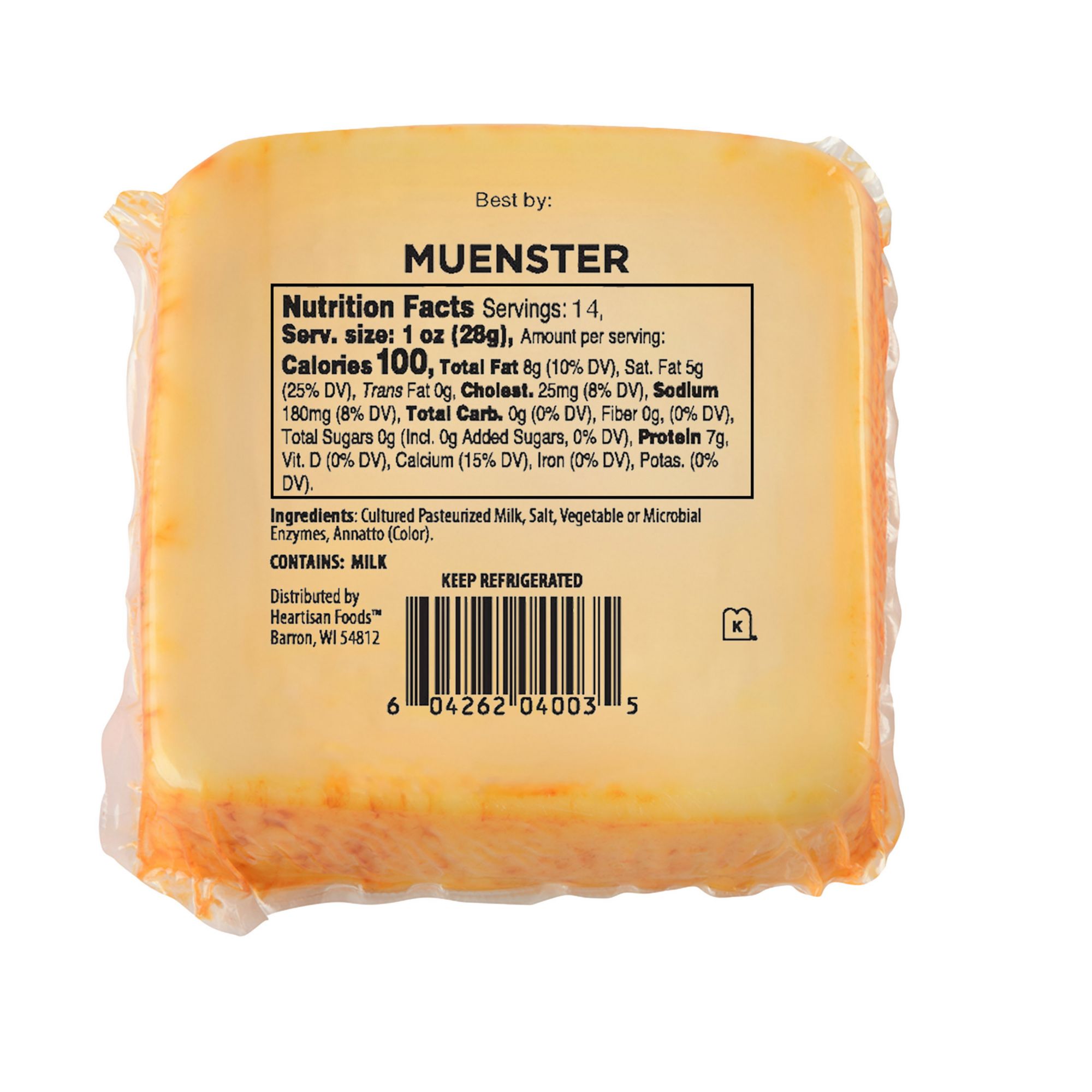 Muenster is a gourmet cheese crafted by Red Apple Cheese, using premium all-natural ingredients for an authentic, smoky Muenster taste. This semi-soft cheese does not use preservatives, artificial flavors, or animal rennet, making it an excellent choice for vegetarian and health-conscious customers. In addition, it is a certified kosher product, so customers of all diet preferences can enjoy it. Muenster is an excellent sandwich cheese, and also pairs well with crackers and fruit.