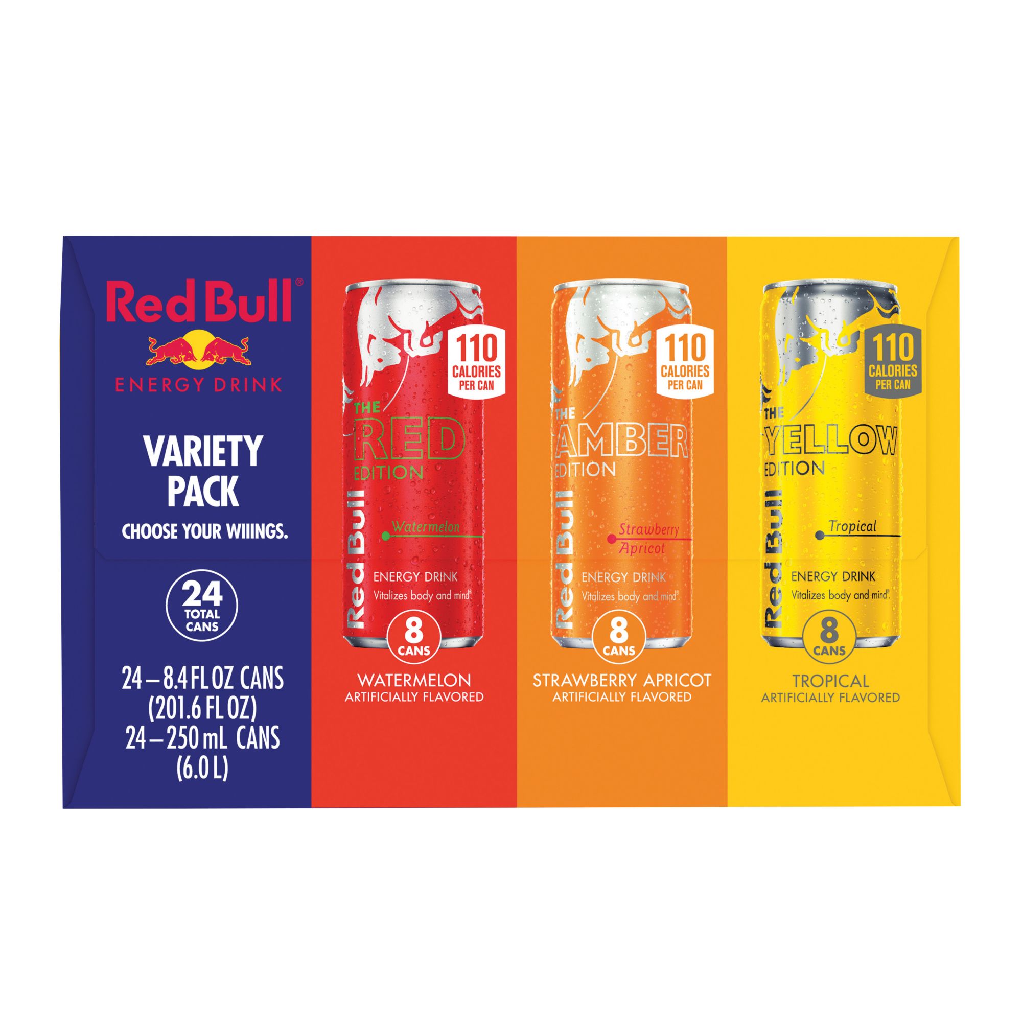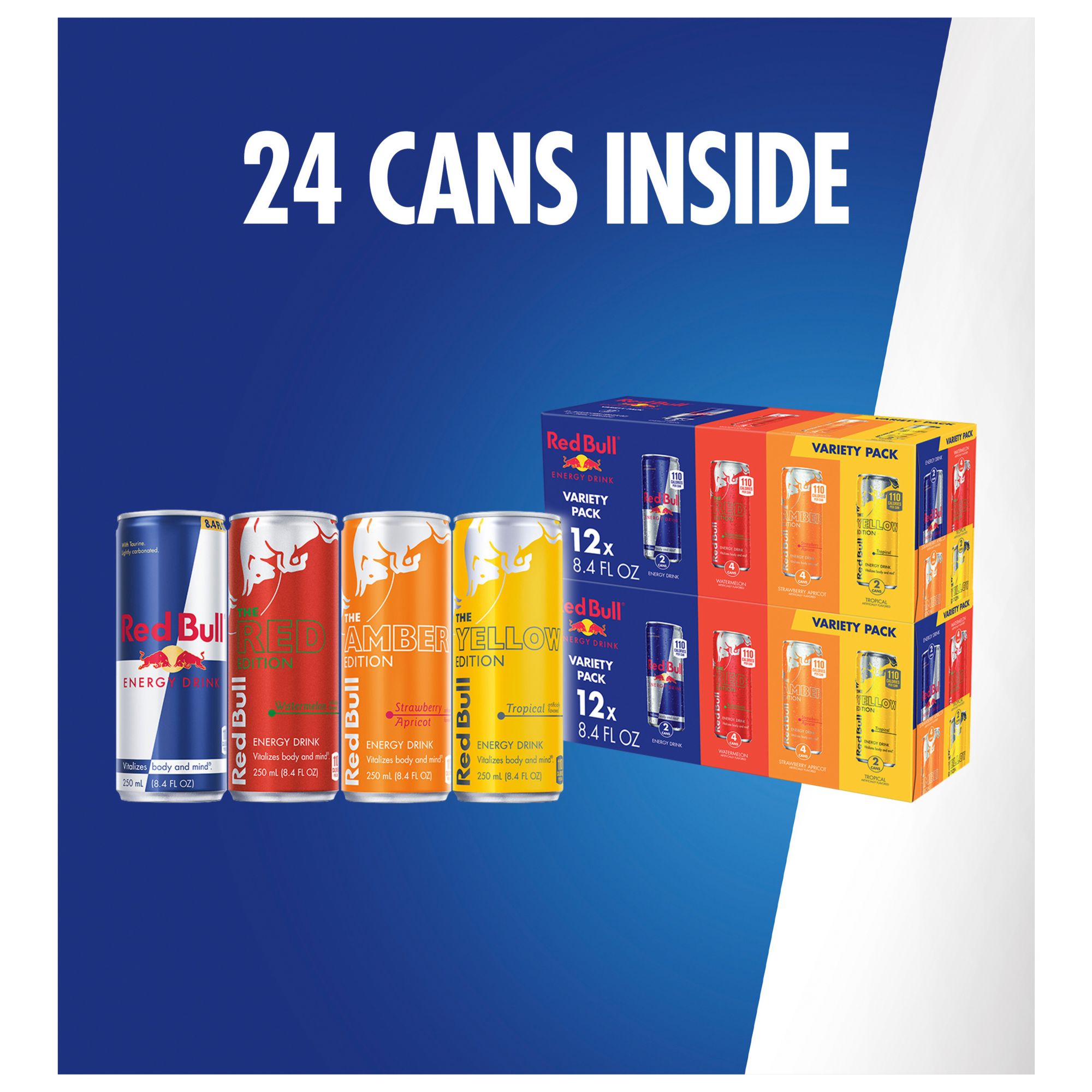 One 24-pack Red Bull Energy Drink Variety Pack with eight 8.4 fl. oz. cans each of Red Bull Red Edition, Amber Edition, and Yellow Edition Energy Drinks