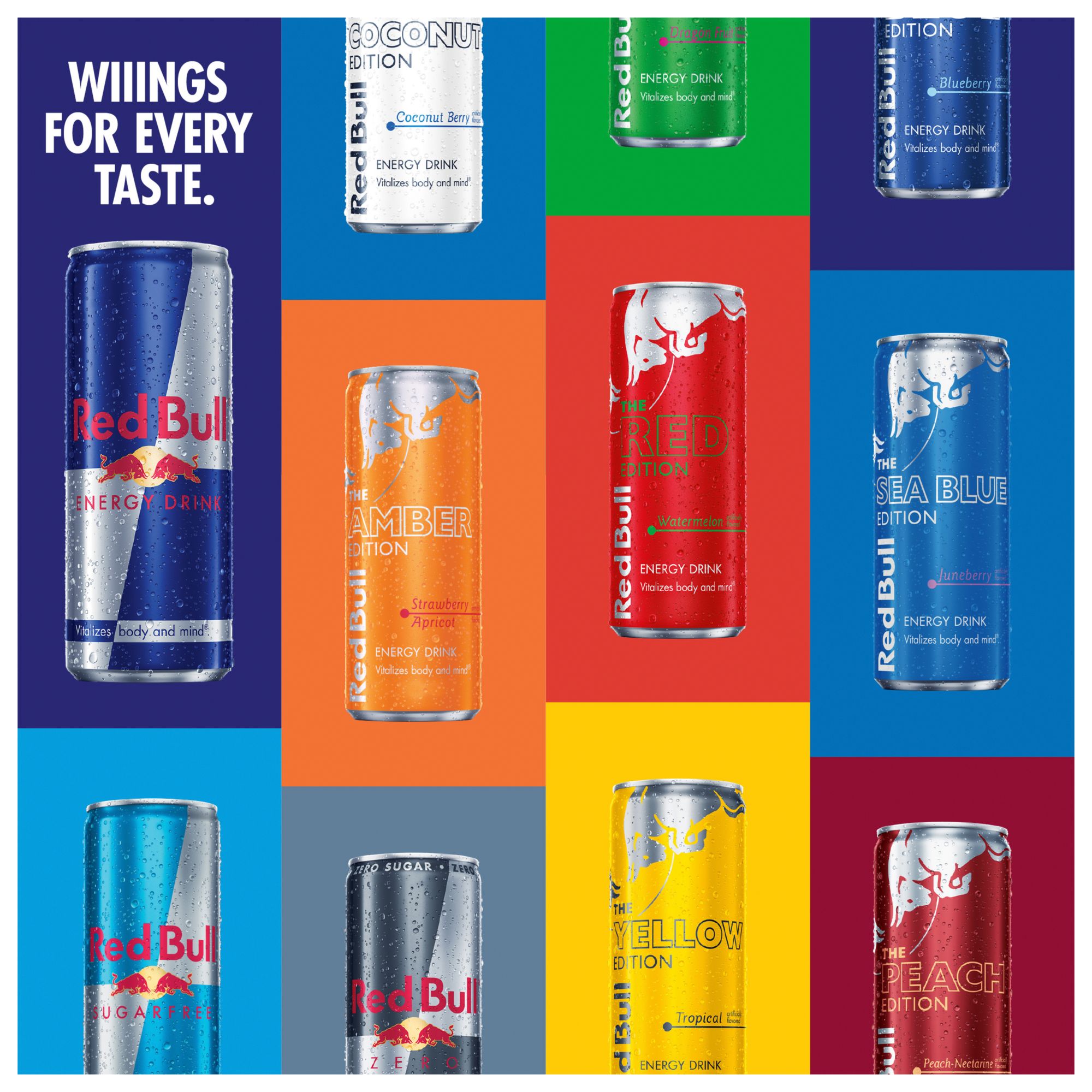 Red Bull Energy Drink gives you Wiiings whenever you need them. Red Bull contains caffeine, taurine, B vitamins, real sugar and water to help get you ready to fly through work, adventures, gaming and more. Drink straight from the can, pour into a glass over ice. Store this 24-can variety pack of Red Bull in the fridge to stay stocked for any occasion. Red Bull gives you Wiiings.
