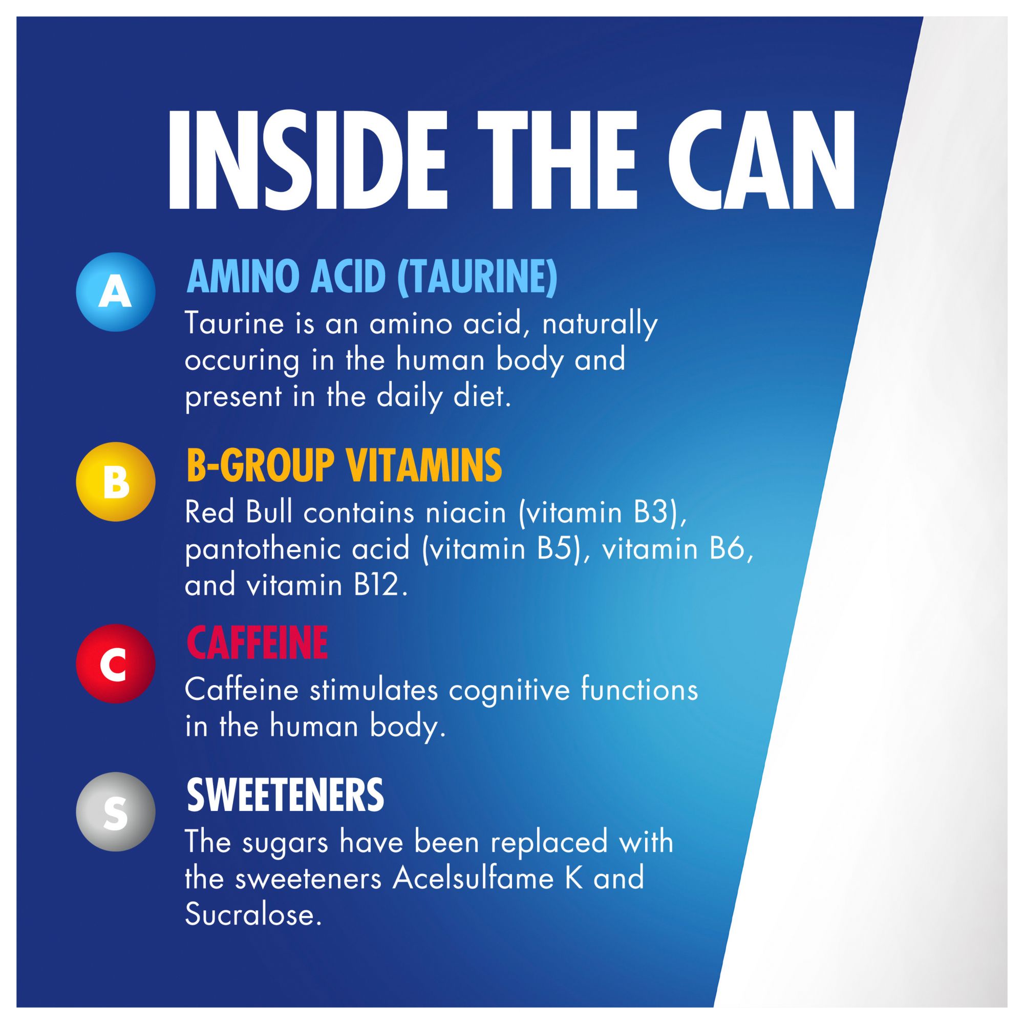 Red Bull Sugar Free features Red Bull’s signature formula that includes caffeine, taurine, B-group vitamins and water, but with no sugar