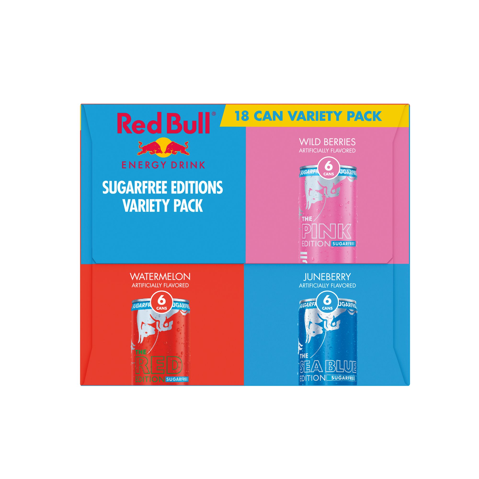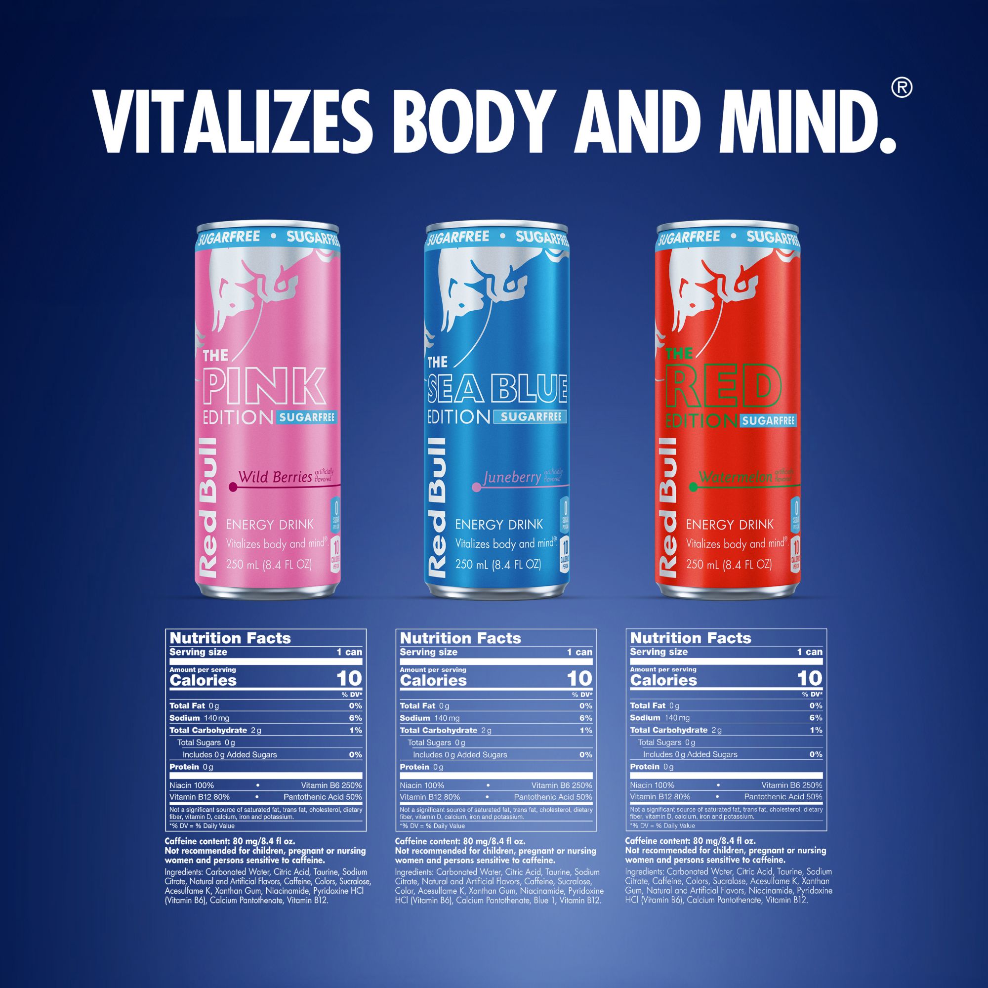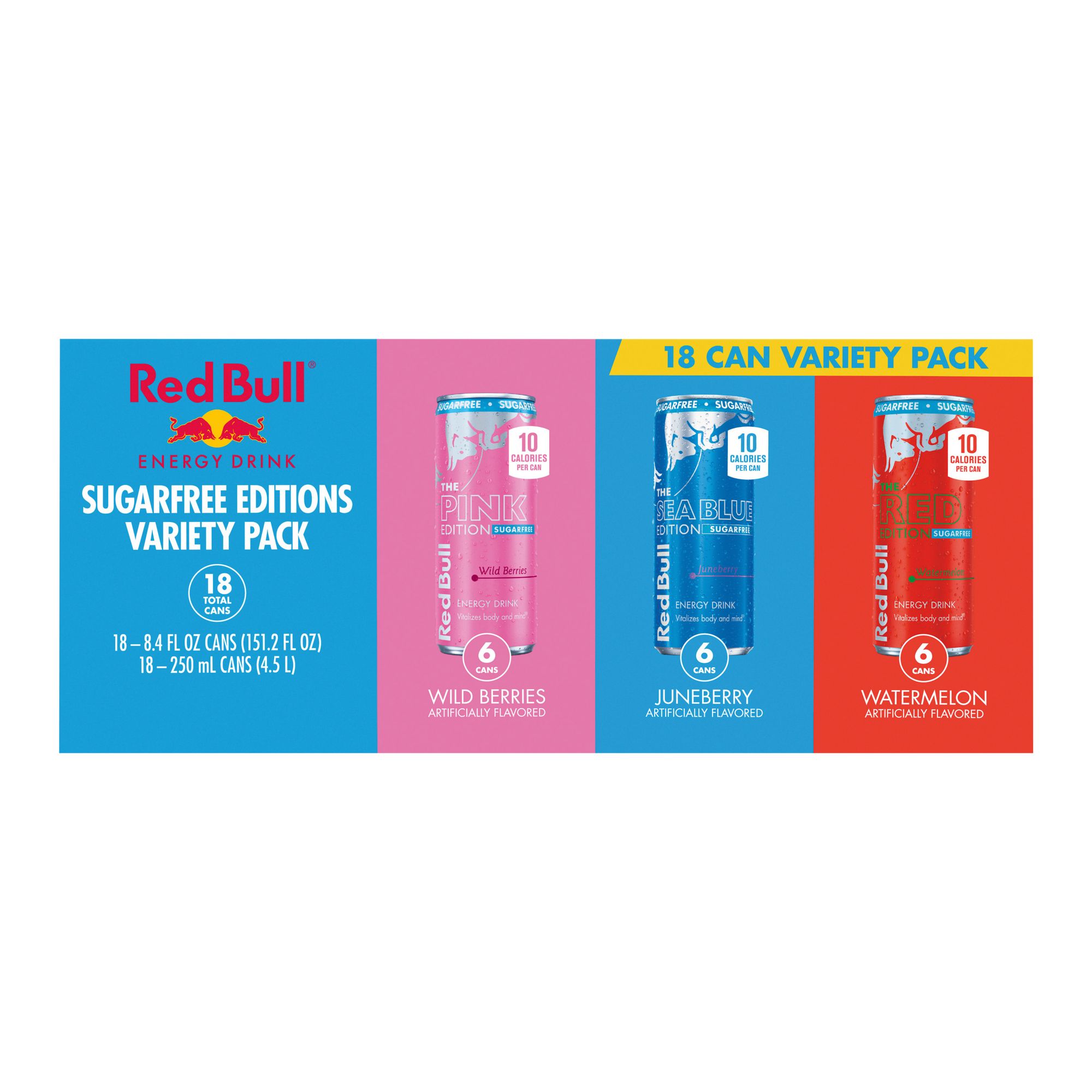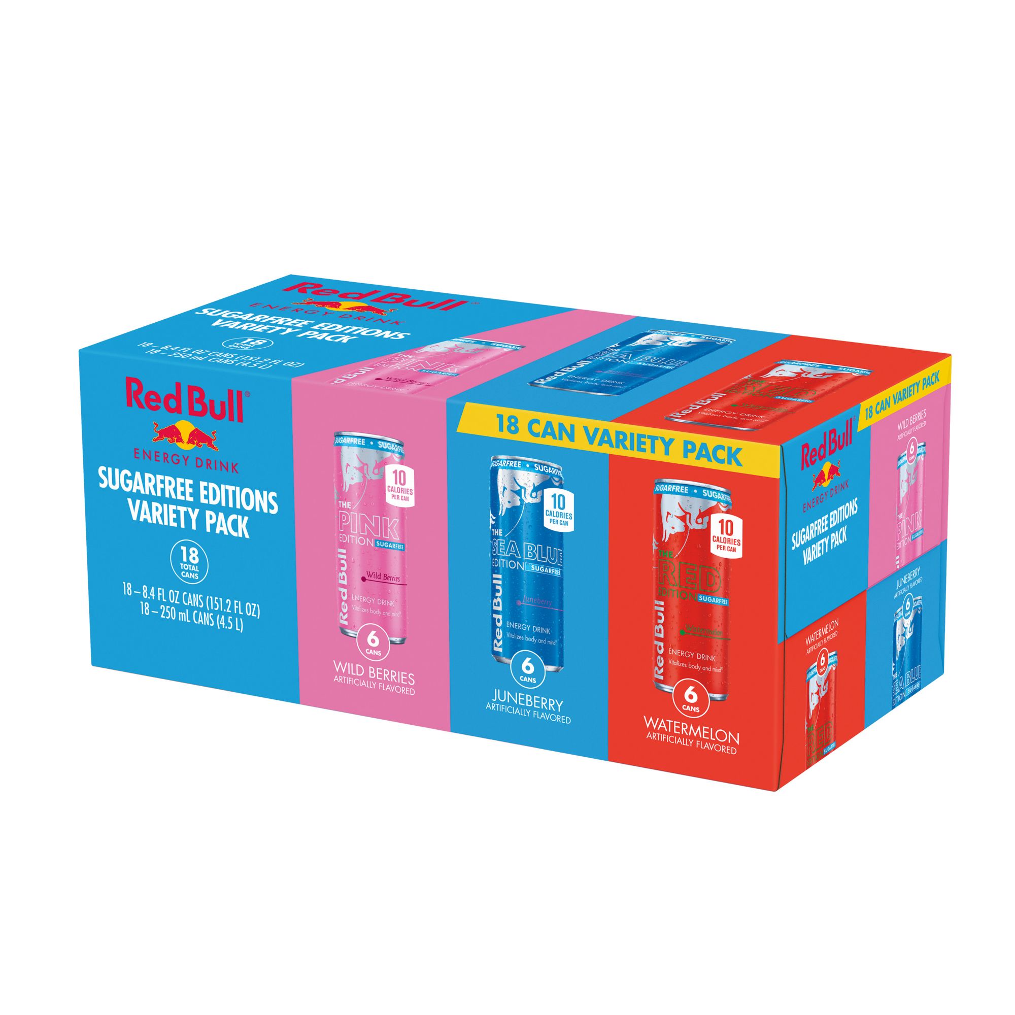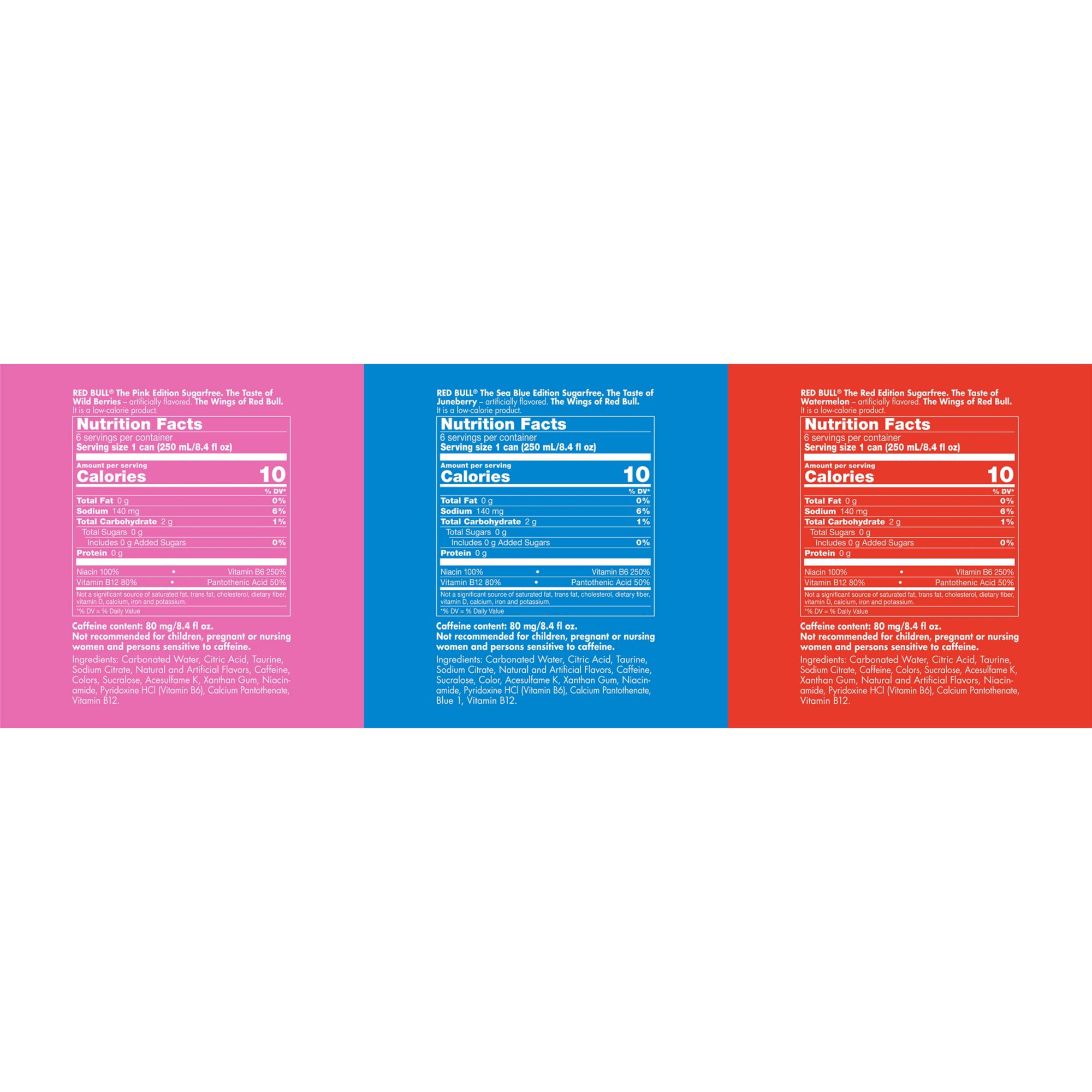 This Sugarfree Variety Pack includes six cans each of Watermelon, Wild Berries, and Juneberry. This lightly carbonated beverage is enjoyed worldwide by fitness enthusiasts, athletes, gamers, students and travelers. A refreshing can of Red Bull makes an excellent partner for busy, active lifestyles. Each 8.4 fl. oz. can contains 80mg of caffeine per serving and 0g sugar. It also includes Taurine, an amino acid naturally occurring in the human body, and B-group vitamins B6, B12, Niacin (B3) and Pantothenic Acid (B5). Available in 12 cans and 24 cans Variety Packs. Comes in aluminum cans that can be recycled over and over. Always check can labels for the most updated product nutritional and ingredient information. Calcium and sugars values declared on labels may vary slightly depending on production locations.