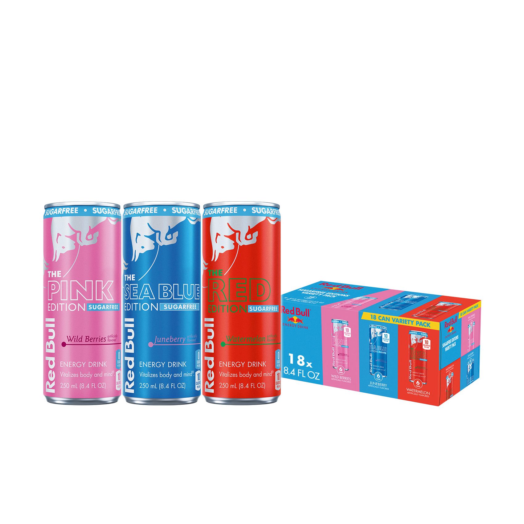 Red Bull Energy Drink SugarFree Variety Pack, Red, Pink, and Sea Blue, Cans, 18 pk./8.4 fl. oz.