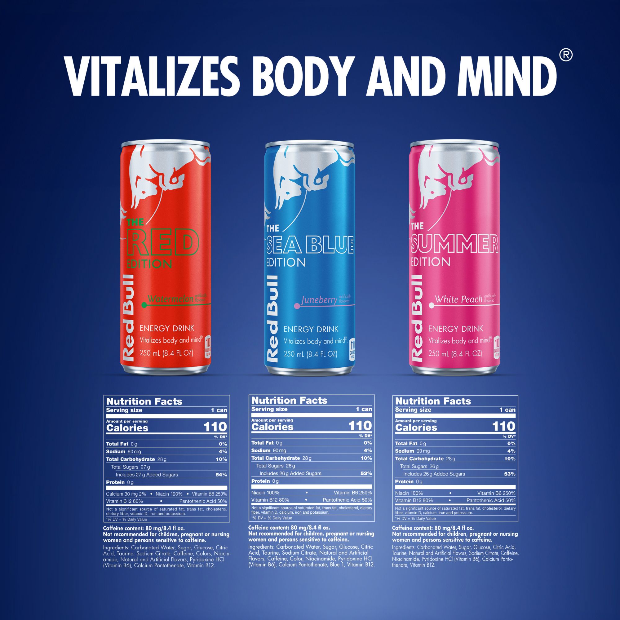 This Variety Pack includes 6 cans each of Watermelon, White Peach, and Juneberry. This lightly carbonated beverage is enjoyed worldwide by fitness enthusiasts, athletes, gamers, students and travelers. A refreshing can of Red Bull makes an excellent partner for busy, active lifestyles. Each 8.4 fl. oz. can contains 80mg of caffeine per serving. It also includes Taurine, an amino acid naturally occurring in the human body, and B-group vitamins B6, B12, Niacin (B3) and Pantothenic Acid (B5). Available in 12 cans and 24 cans Variety Packs. Comes in aluminum cans that can be recycled over and over. Always check can labels for the most updated product nutritional and ingredient information. Calcium and sugars values declared on labels may vary slightly depending on production locations.