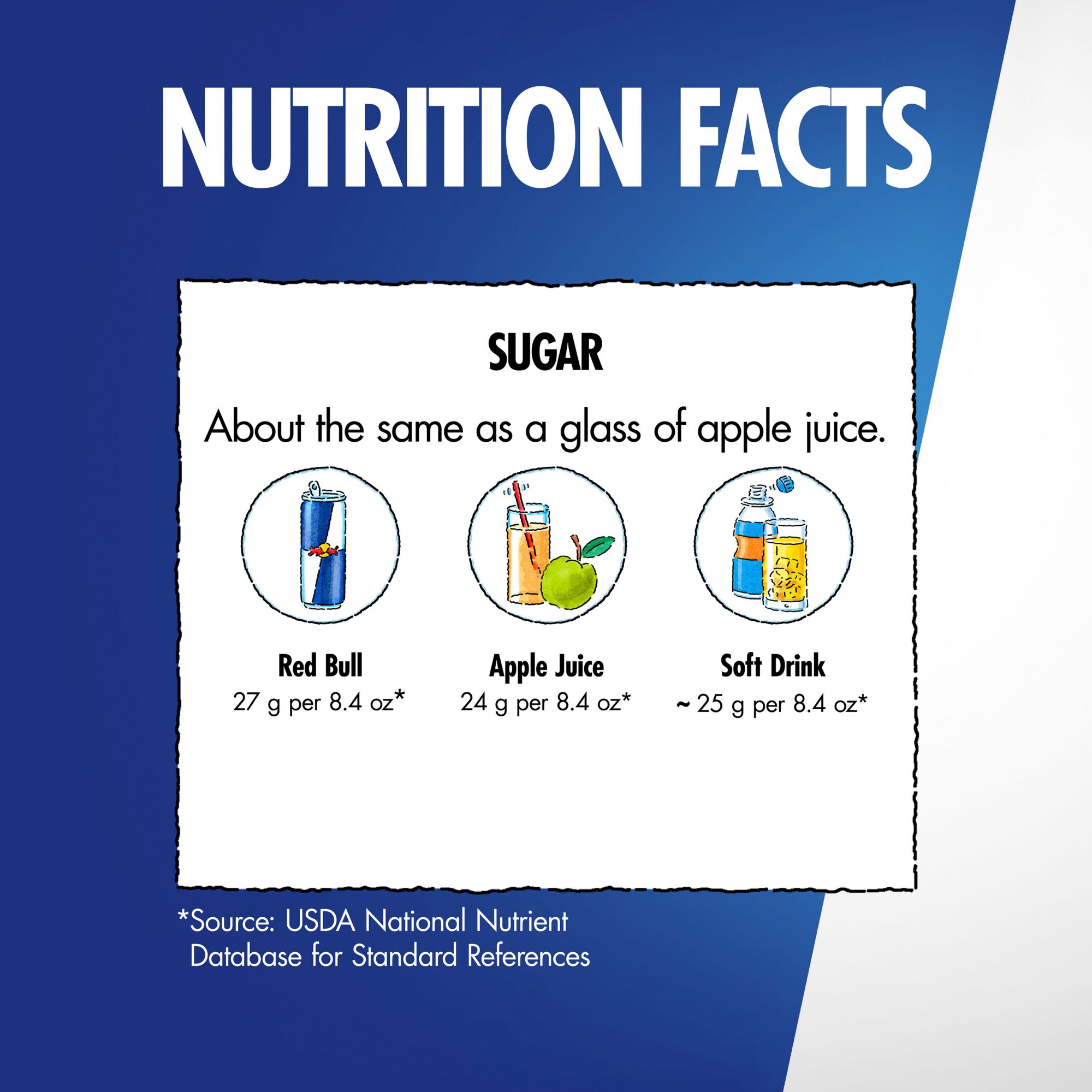 One 8.4 fl. oz. can of Red Bull Energy Drink contains 27 g of sugar, comparable to sugar levels found in apple juice of equal size