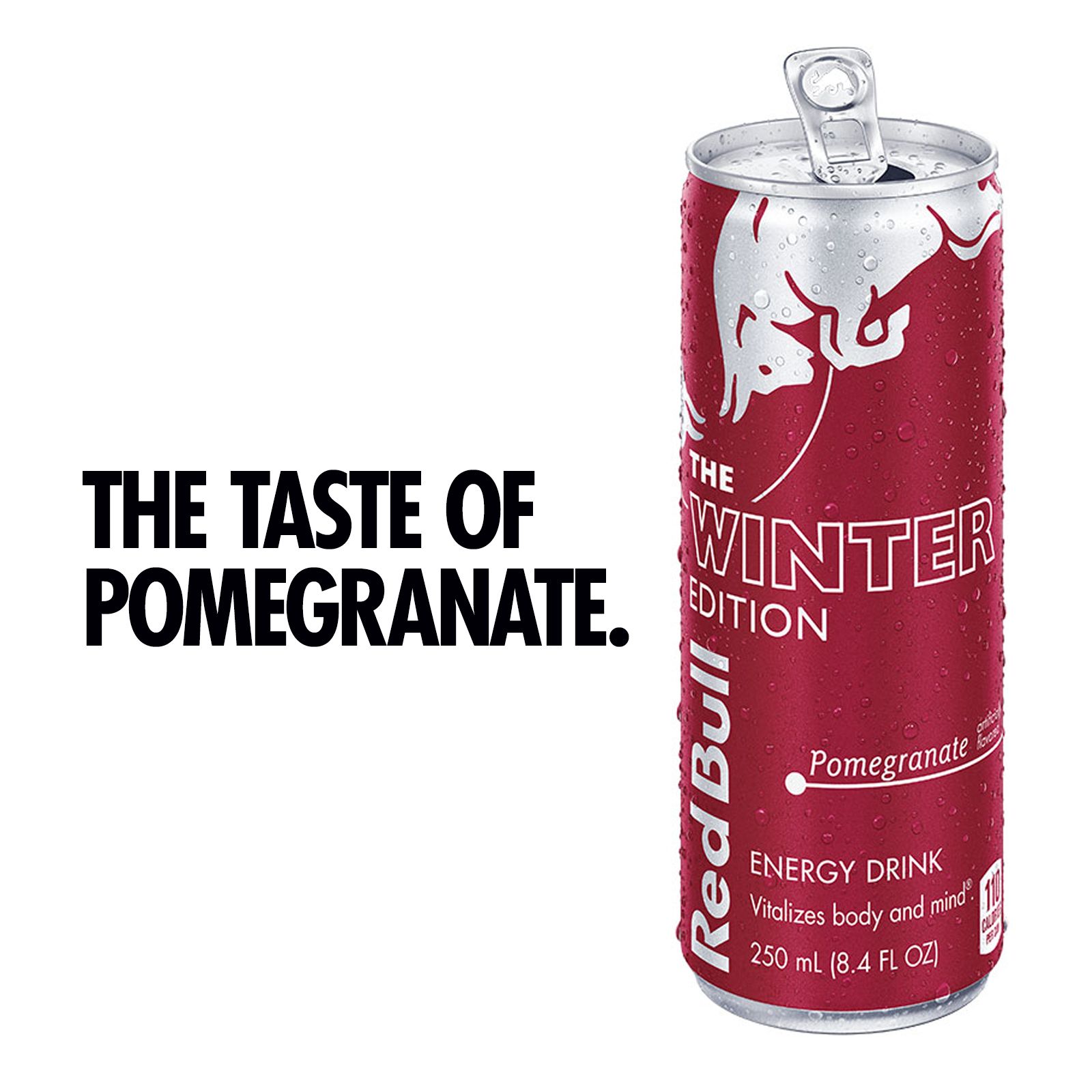 Pomegranate has a refreshing flavor that is soothing and relaxing. This limited time Red Bull contains vitamins, natural, and artificial flavors.