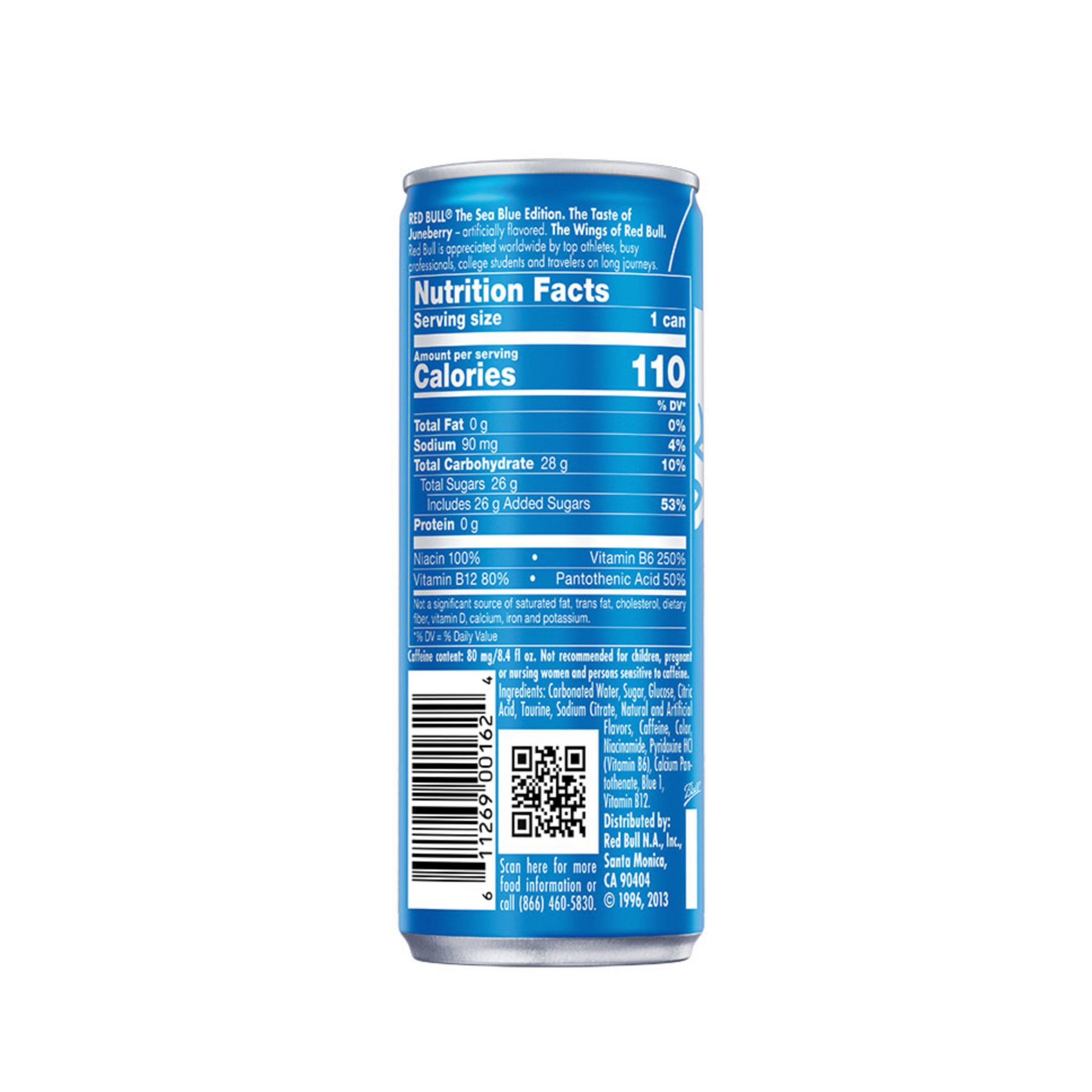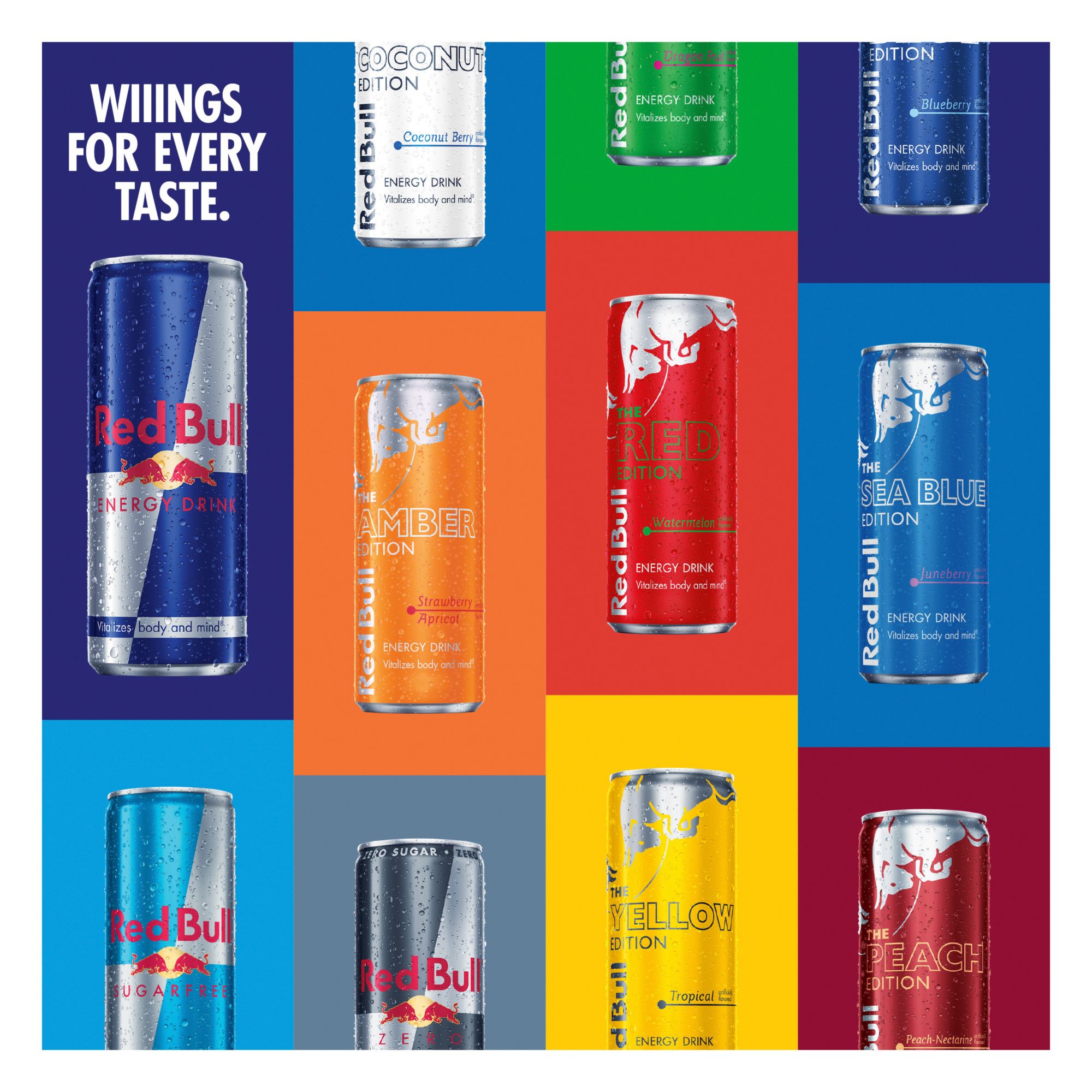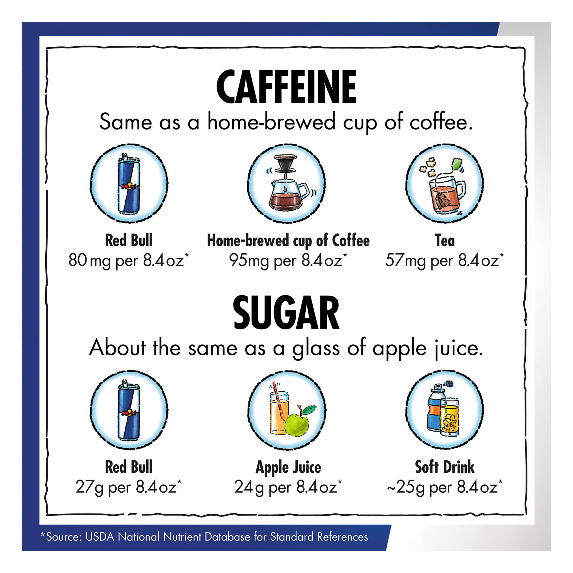 Red Bull gives you wings: Reach for the wiiings of Red Bull for energy you can feel. While aiming for great heights during your workday, in your workouts or when gaming, Red Bull Energy Drink is lightly carbonated with a blend of premium ingredients. What's inside the can: Caffeine: Caffeine primarily stimulates cognitive functions in the human body. Caffeine (mg) per Single Serving (can): 8.4 fl oz can of Red Bull Energy Drink - 80 mg. B-group Vitamins: Contains four essential micronutrients (B3 [Niacinamide], B5 [Calcium Panthothenate], B6 [Pyridoxine HCl], & B12). Taurine: Taurine is an amino acid that is naturally present in the human body and available across many daily diets. Real Sugar: Made with real sugar. Quantities comparable to that of an equal sized cup of apple juice. Water: Naturally, water is a main ingredient of Red Bull.