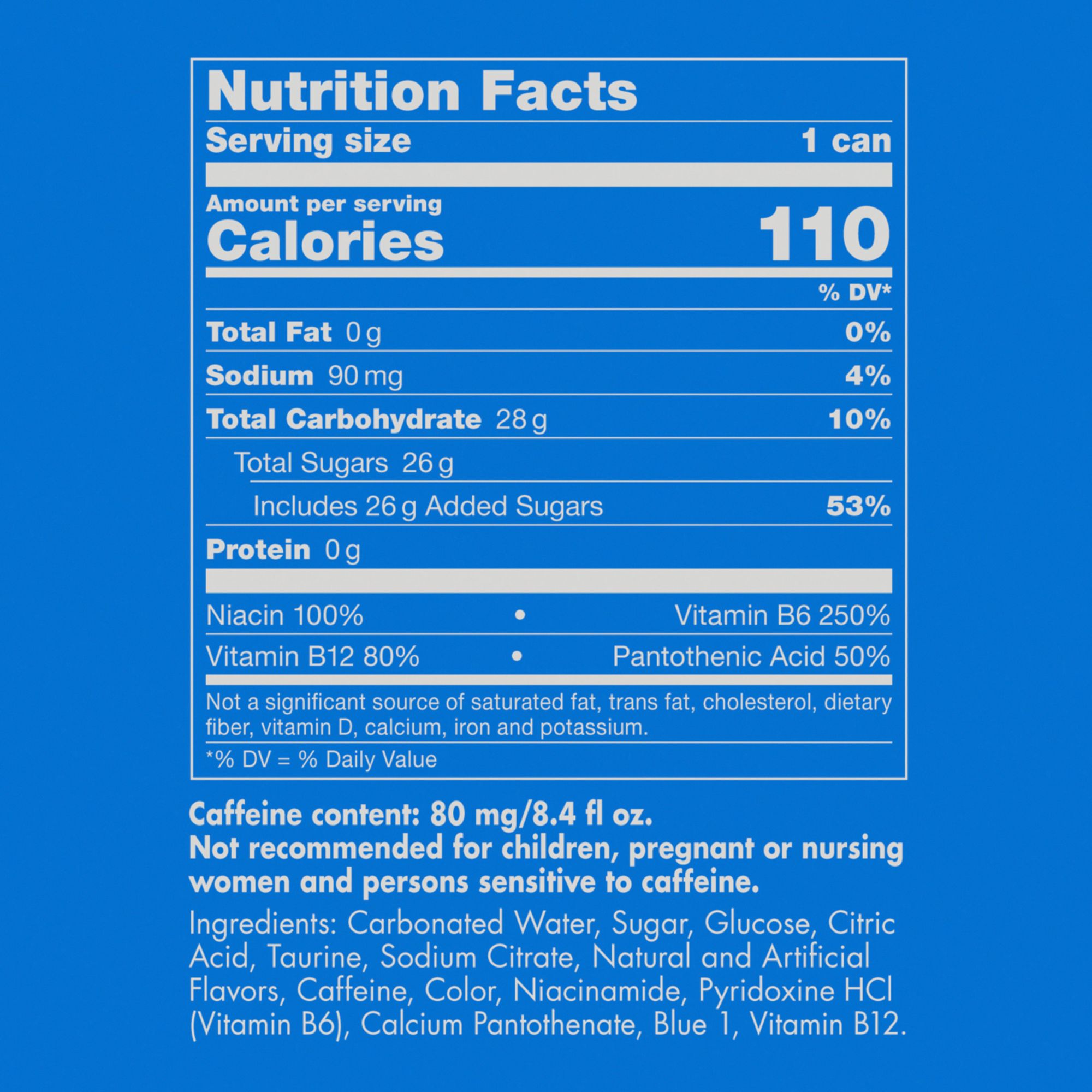 Ingredients: Carbonated Water, Sugar, Glucose, Citric Acid, Taurine, Sodium Citrate, Natural and Artificial Flavors, Caffeine, Color, Niacinamide, Pyridoxine Hcl (Vitamin B6), Calcium Pantothenate, Blue 1, Vitamin B12