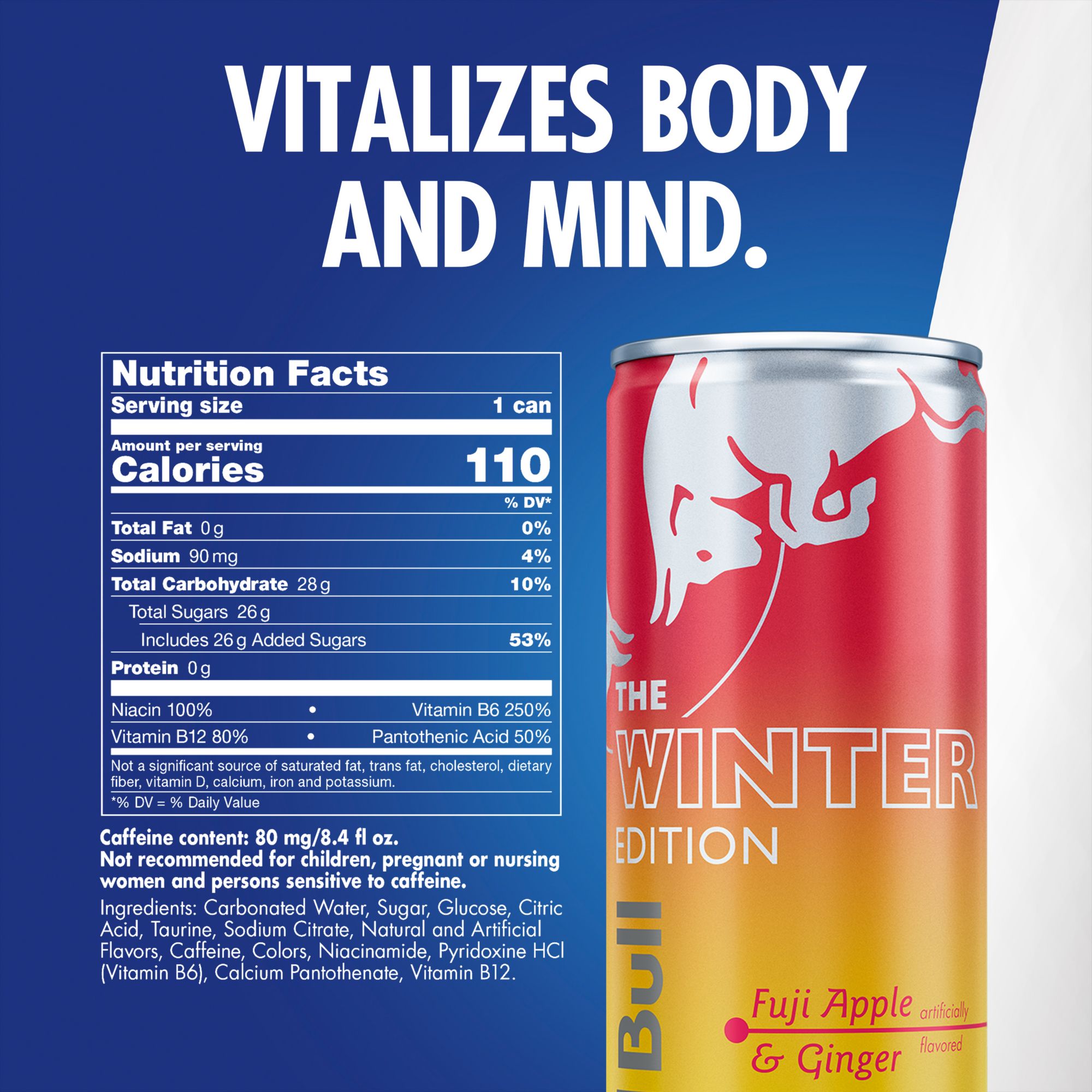 This Red Bull Winter Edition features the taste of Juicy Fuji Apple with a touch of Ginger. This lightly carbonated beverage is enjoyed worldwide by fitness enthusiasts, athletes, gamers, students and travelers. A refreshing can of Red Bull makes an excellent partner for busy, active lifestyles. Each 8.4 fl. oz. can contains 80mg of caffeine per serving and 26g of sugar (comparable to sugar levels found in apple juice). It also includes Taurine, an amino acid naturally occurring in the human body, and B-group vitamins B6, B12, Niacin (B3) and Pantothenic Acid (B5). Available in single can, 4-packs and 24-packs. Comes in aluminum cans that can be recycled over and over. Always check can labels for the most updated product nutritional and ingredient information. Calcium and sugars values declared on labels may vary slightly depending on production locations.