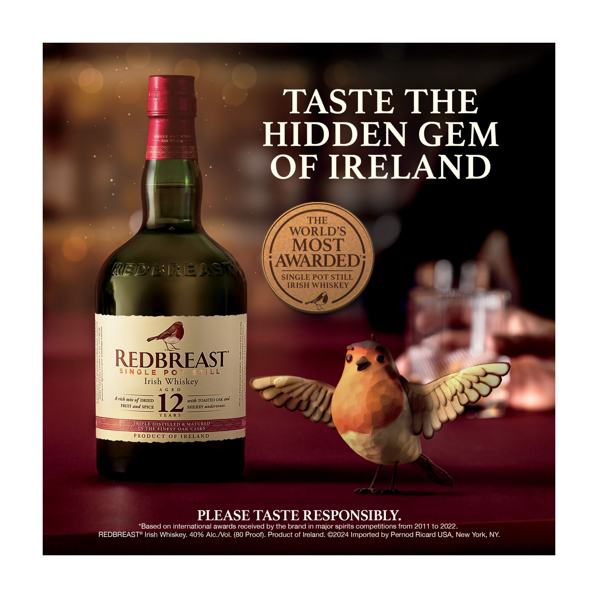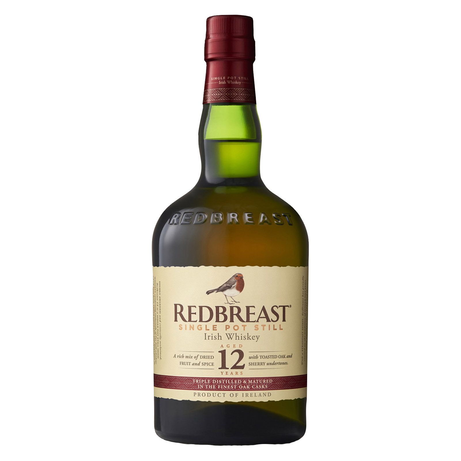 Redbreast is the World's Most Awarded Single Pot Still Irish Whiskey. Redbreast 12 Year Old Single Pot Still Irish Whiskey is the brand's signature bottling and the definitive introduction to the Redbreast range with the flavor complexity and distinctive qualities of pot still whiskey. Made from a mash of malted and unmalted barley, this liquor features a complex spicy and fruity aroma with toasted wood notes evident. Full-flavored, complex and silky smooth alcohol offers a harmonious balance of spicy, fruity, sherry and toasted notes, leading to a satisfyingly long finish with complex flavors that linger on the palate. The Irish whiskey is triple distilled in copper pots and matured in a combination of Bourbon-seasoned American oak barrels and Oloroso Sherry-seasoned Spanish oak butts, creating a distinctive sherry style that's a joy to behold. Enjoy Redbreast neat or on the rocks in a whiskey glass, or use it to make your favorite alcohol drinks and cocktails, including an Old Fashioned or Whiskey Sour. Discover the Redbreast family flock of whiskeys. Drink Responsibly.