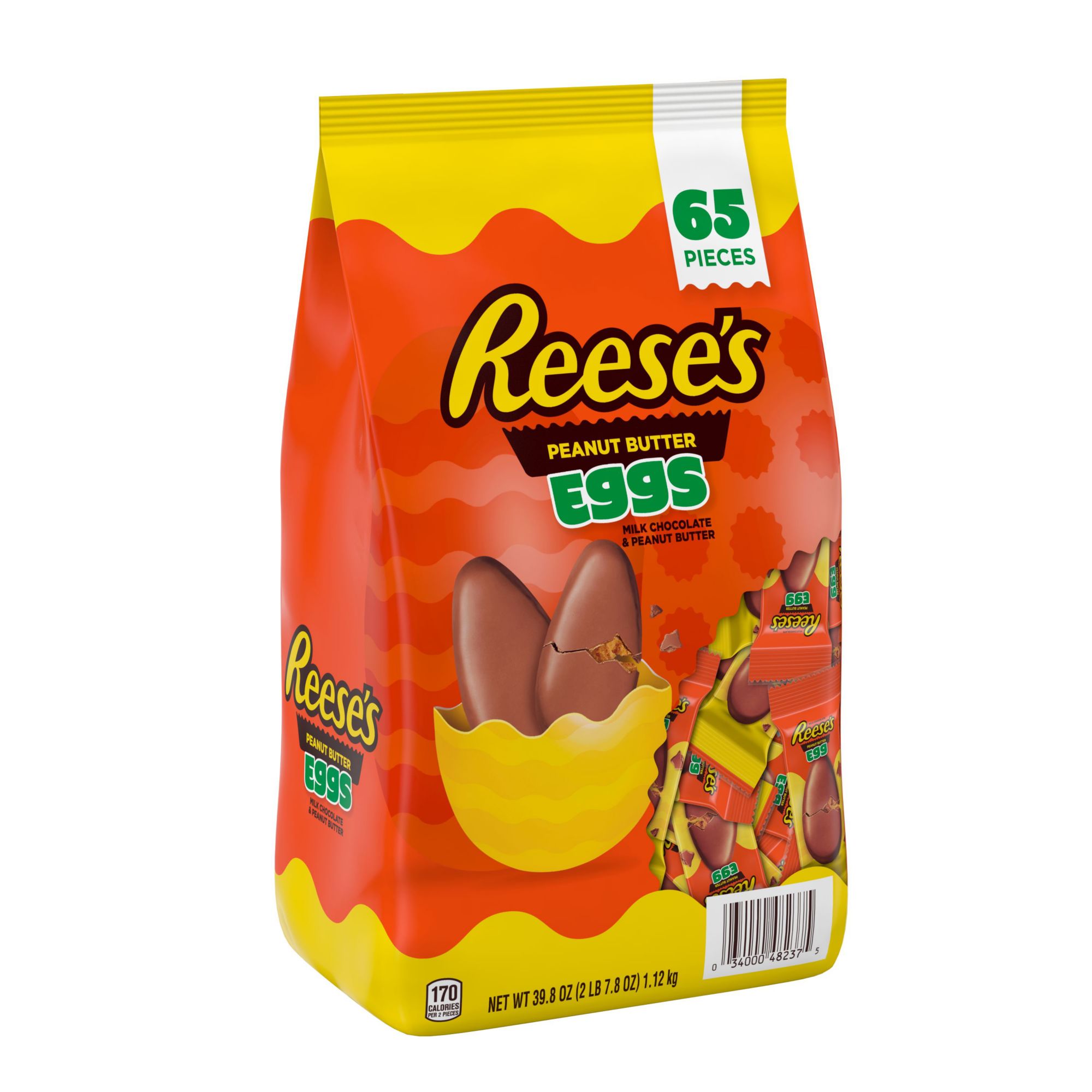 Enjoy egg-shaped milk chocolate peanut butter candies after dying eggs or as a tasty Easter dessert Unwrap Reese's candy during Mother's day celebrations, spring sporting events, graduations and birthday parties Celebrate Easter egg hunts and stuff Easter candy baskets with the unforgettable taste of Reese's peanut butter egg-shaped candies Create new Easter desserts with Reese's peanut butter eggs candies that even the Easter bunny will want to try Contains 65 individually wrapped kosher milk chocolate peanut butter egg candies packed in bulk in springtime wrapping Includes one 65 Pc./39.8 oz., bulk bag of Reese's milk chocolate peanut butter eggs candy