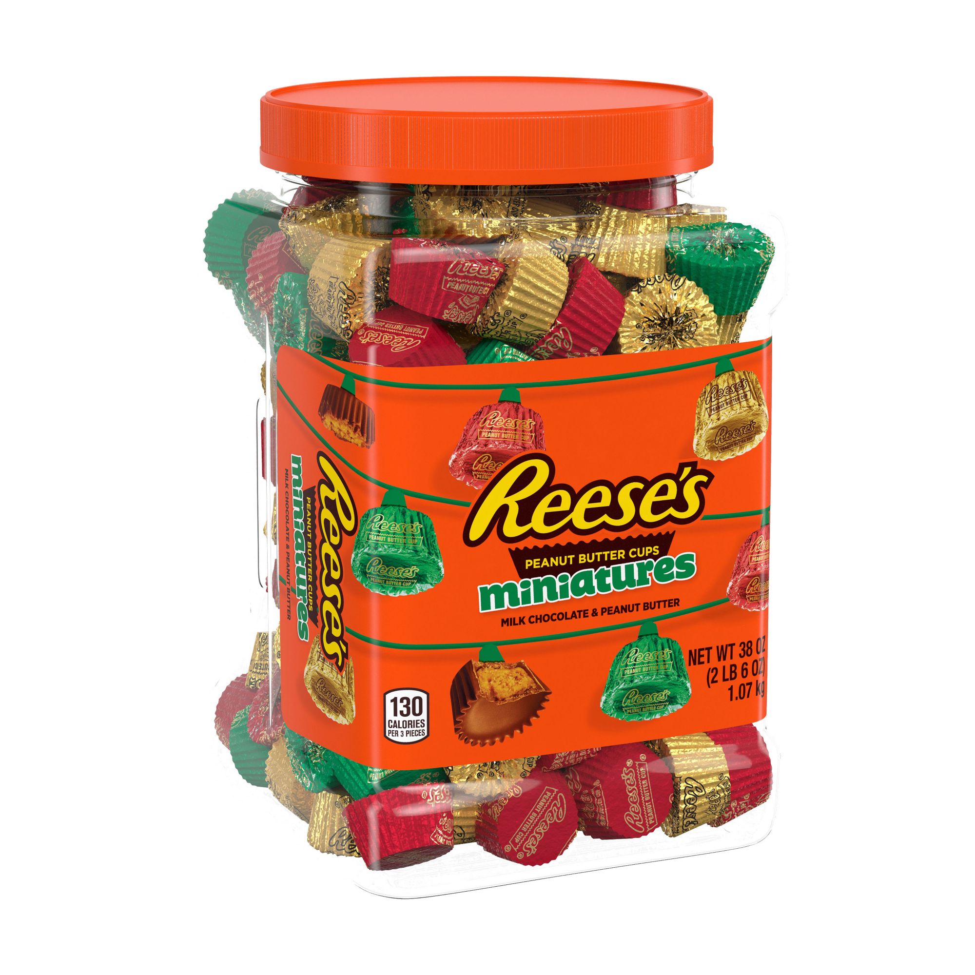 Includes bulk jar of Reese's miniatures milk chocolate peanut butter cups, 38 oz.