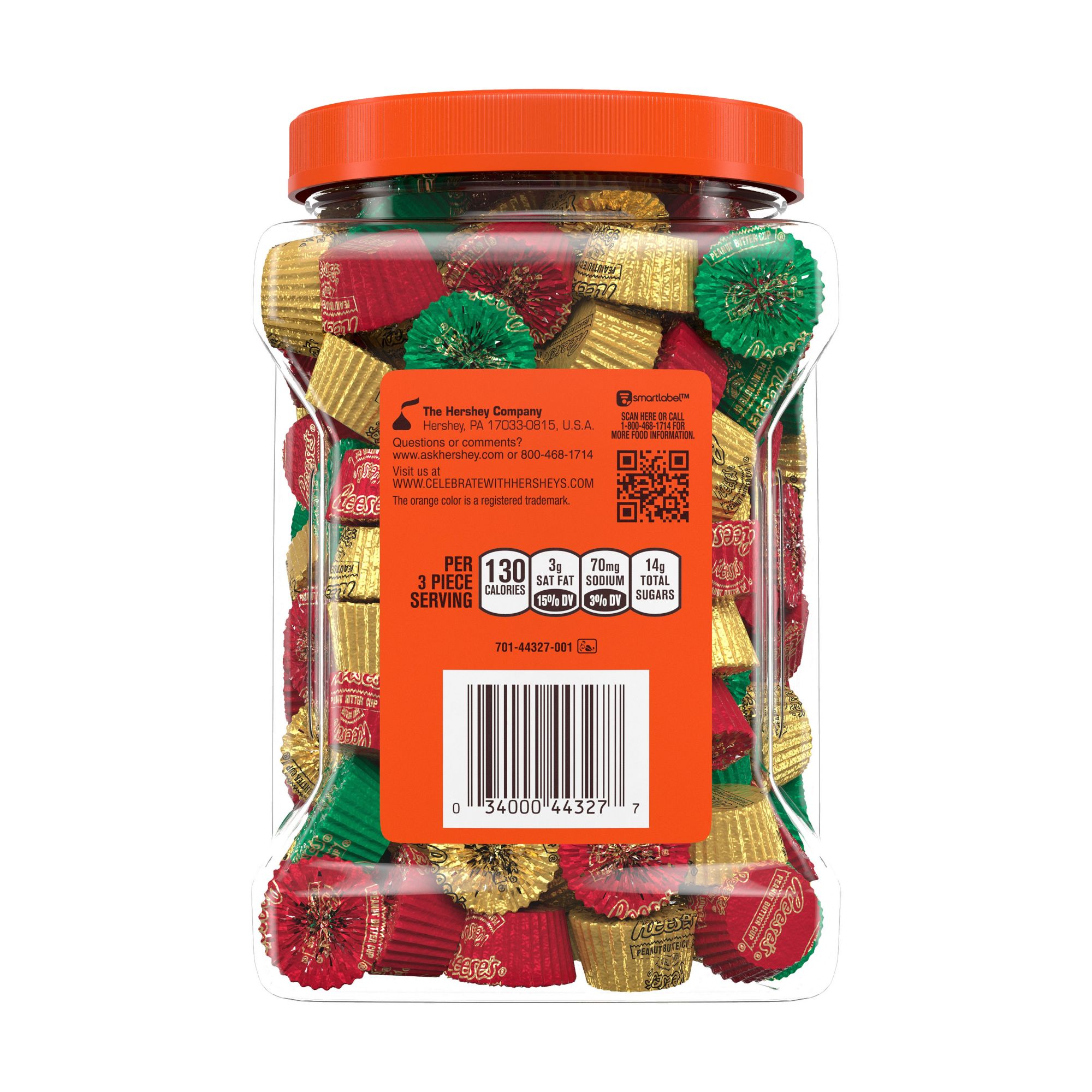 Bring holiday cheer to your next gathering with blissful flavors of a Reese's Miniatures milk chocolate peanut butter cup. A taste of this sweet treat is sure to get you into the holiday spirit. Individually wrapped and packed in a convenient plastic bulk candy jar, you'll have plenty to share with friends and family during all your festive get-togethers! You can bring this jar along with you on road trip adventures, enjoy a pick-me-up at the office, or use it as a grand prize at your next Christmas party. Give the best gift this holiday season by wrapping a bulk Reese's Miniatures candy jar and placing it under the tree. Don't be surprised if Santa takes a few with him too. Having a Christmas movie night? Fill candy bowls with Reese's cups or create new desserts like Reese's peanut butter temptations to eat during your favorite film! Plus, it looks stellar when added to gingerbread houses. Wrap your favorite cookie dough around a miniature peanut butter cup, crumble individual candies over brownies or bake chocolatey peanut butter cakes to share with loved ones. These holiday candies are kosher-certified, making them perfect for sharing with friends, family, teammates, co-workers and classmates.