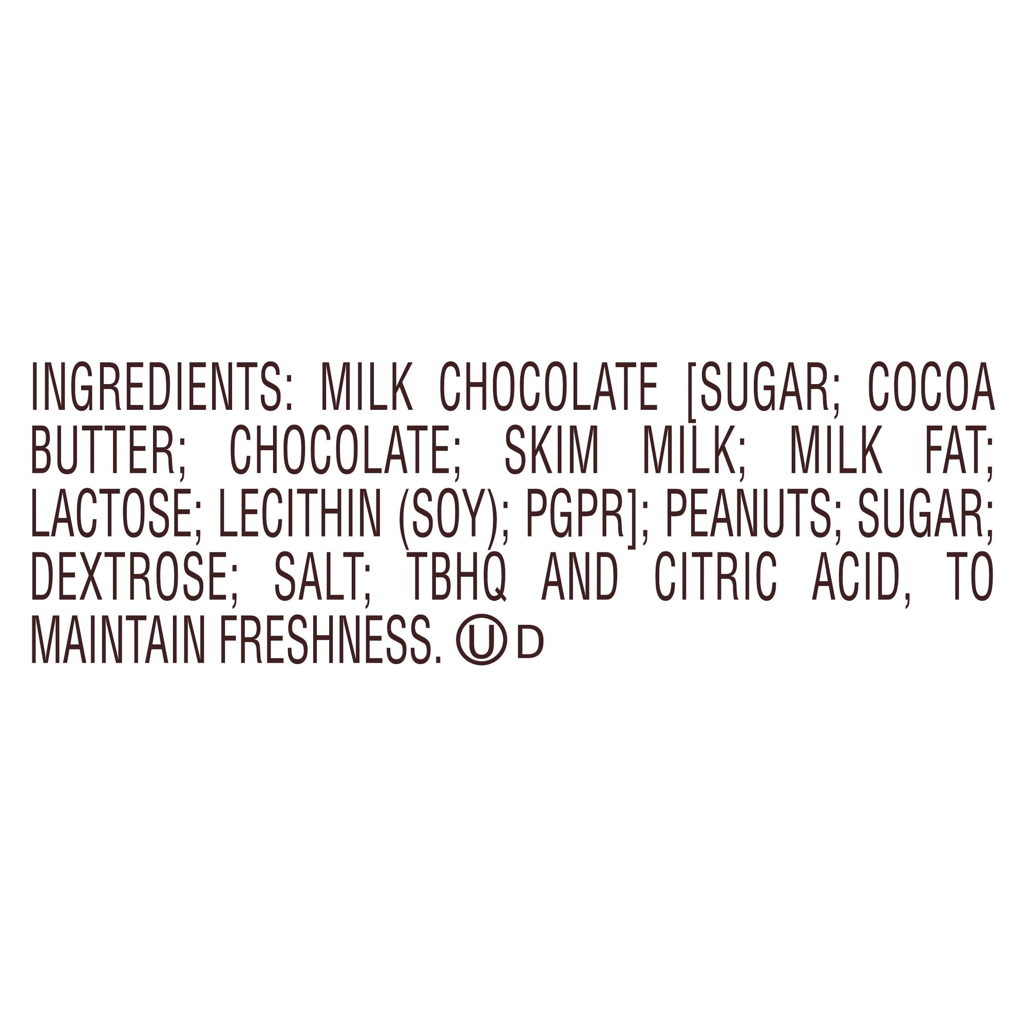 Ingredients: Milk Chocolate [Sugar; Cocoa Butter; Chocolate; Skim Milk; Milk Fat; Lactose; Lecithin (Soy); PGPR]; Peanuts; Sugar; Dextrose; Salt; TBHQ and Citric Acid to Maintain Freshness.
