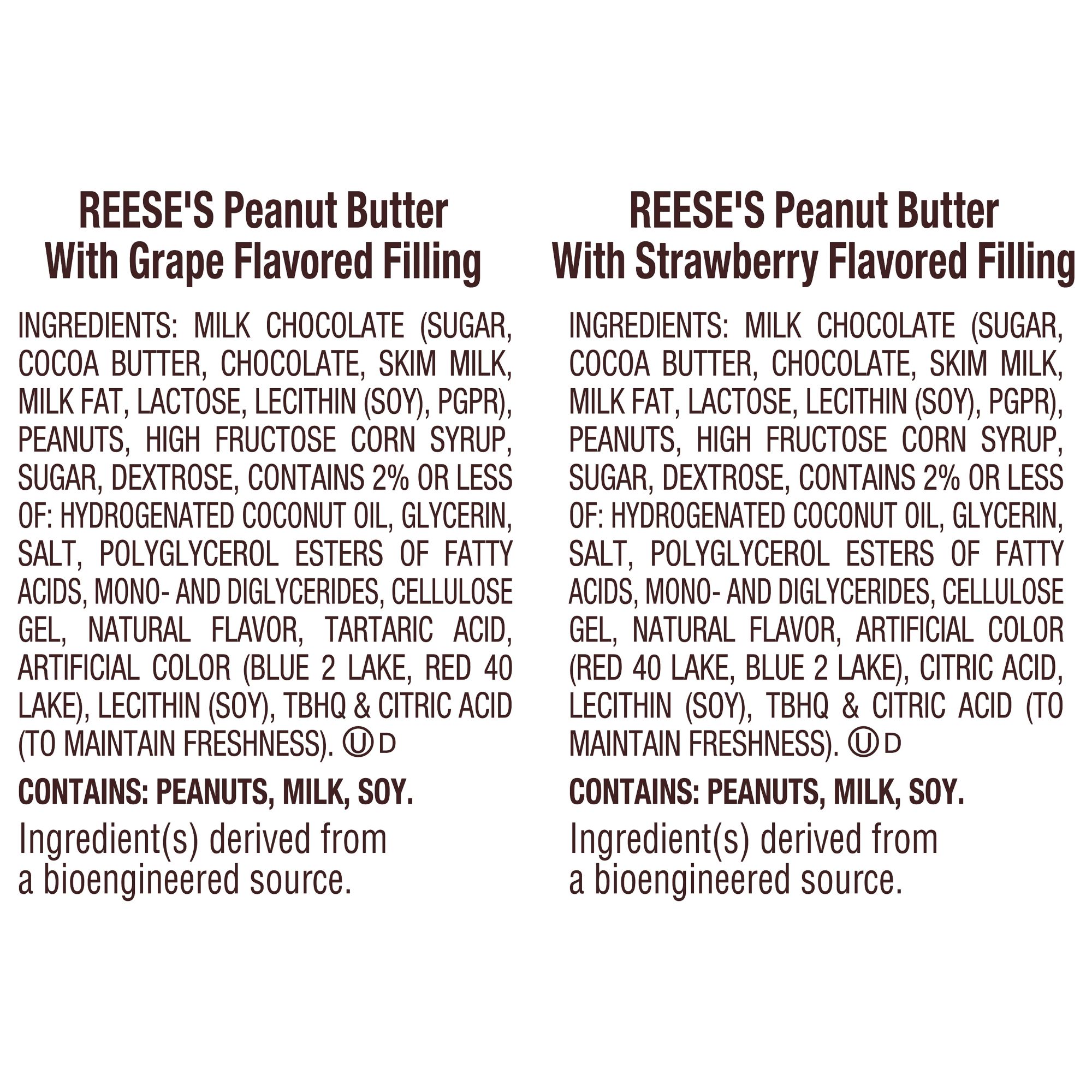Get ready to taste perfection! You can't beat the old-fashioned, match-made-in-heaven when it comes to creamy milk chocolate combined with delicious peanut butter, now with a decadent layer of strawberry and grape flavored filling. Reese's PB&J Assorted Flavored Milk Chocolate Snack Size Peanut Butter Cups are ready to be your go-to snack. Bring a few packs along to the next sporting event, party, movie marathon, game night and so many other activities for an extra bite of nostalgic goodness. Store a few packs in your pantry to easily slip into lunch boxes and purses for a midday surprise. These strawberry and grape flavor-filled peanut butter Reese's cups are a sweet delight that you can bite, break, dunk or nibble on. Dunk one into a cold glass of milk, a cup of hot chocolate or your coffee to experience the melty goodness. Put a unique twist on cookies, cupcakes and ice cream sundaes with whole, halved or crumbled Reese's cups. These kosher certified and gluten free treats go well with almost everything, especially during your holiday celebrations. Add a pack to Christmas stockings, Halloween candy bowls, Valentine's Day gift bags and Easter baskets. Just don't forget to save a few Reese's PB&J Assorted Flavored Milk Chocolate Snack Size Peanut Butter Cups for yourself!