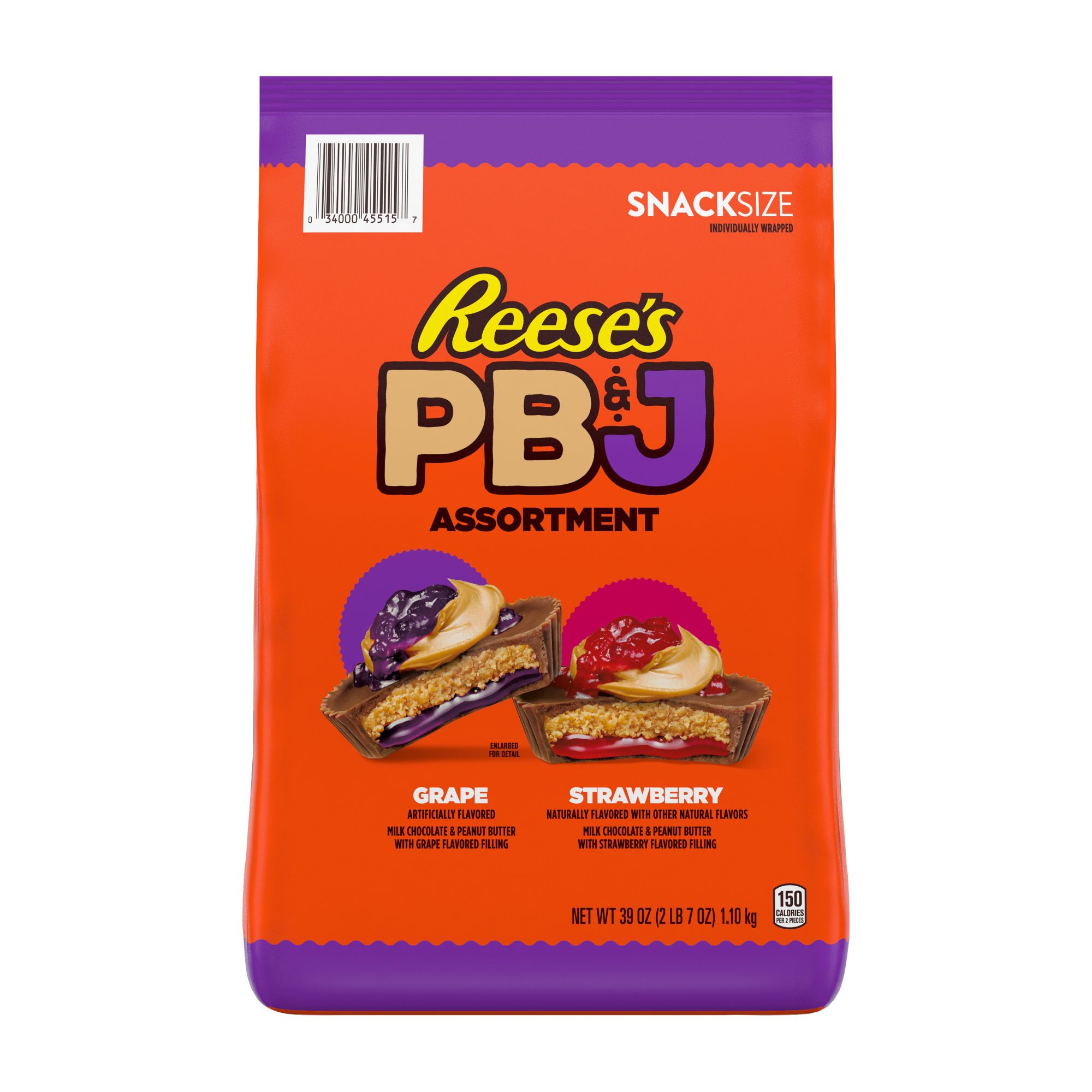 Get ready to taste perfection! You can't beat the old-fashioned, match-made-in-heaven when it comes to creamy milk chocolate combined with delicious peanut butter, now with a decadent layer of strawberry and grape flavored filling. Reese's PB&J Assorted Flavored Milk Chocolate Snack Size Peanut Butter Cups are ready to be your go-to snack. Bring a few packs along to the next sporting event, party, movie marathon, game night and so many other activities for an extra bite of nostalgic goodness. Store a few packs in your pantry to easily slip into lunch boxes and purses for a midday surprise. These strawberry and grape flavor-filled peanut butter Reese's cups are a sweet delight that you can bite, break, dunk or nibble on. Dunk one into a cold glass of milk, a cup of hot chocolate or your coffee to experience the melty goodness. Put a unique twist on cookies, cupcakes and ice cream sundaes with whole, halved or crumbled Reese's cups. These kosher certified and gluten free treats go well with almost everything, especially during your holiday celebrations. Add a pack to Christmas stockings, Halloween candy bowls, Valentine's Day gift bags and Easter baskets. Just don't forget to save a few Reese's PB&J Assorted Flavored Milk Chocolate Snack Size Peanut Butter Cups for yourself!