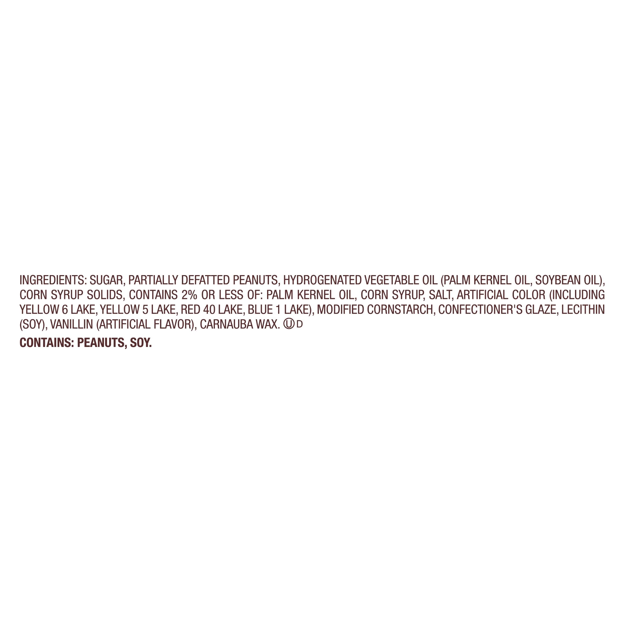 Ingredients: Sugar, Partially Defatted Peanuts, Hydrogenated Vegetable Oil (Palm Kernel Oil, Soybean Oil), Corn Syrup Solids, Contains 2% Or Less Of: Palm Kernel Oil, Corn Syrup, Salt, Artificial Color (Including Yellow 6 Lake, Yellow 5 Lake, Red 40 Lake, Blue 1 Lake), Modified Cornstarch, Confectioner's Glaze, Lecithin (Soy), Vanillin (Artificial Flavor), Carnauba Wax.