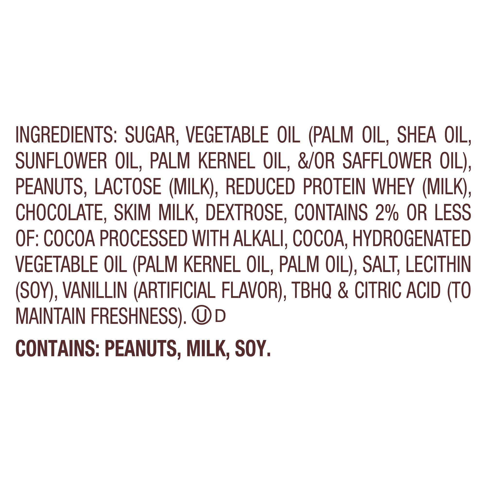 Ingredients: Sugar, Vegetable Oil (Palm Oil, Shea Oil, Sunflower Oil, Palm Kernel Oil, &/Or Safflower Oil), Peanuts, Lactose (Milk), Reduced Protein Whey (Milk), Chocolate, Skim Milk, Dextrose, Contains 2% Or Less Of: Cocoa Processed With Alkali, Cocoa, Hydrogenated Vegetable Oil (Palm Kernel Oil, Palm Oil), Salt, Lecithin (Soy), Vanillin (Artificial Flavor), Tbhq & Citric Acid (To Maintain Freshness).