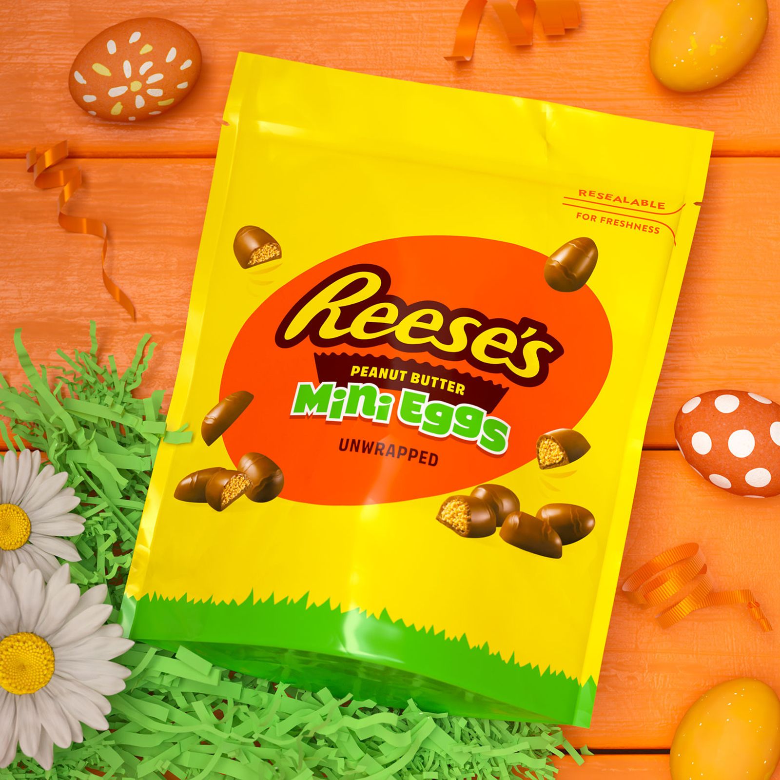 Savor the unmistakably delicious taste of Reese's Unwrapped Chocolate Peanut Butter Creme Mini Eggs candy. It's the same yummy peanut butter creme taste you know and love ready for when the Easter Bunny arrives this spring. Unwrapped peanut butter creme eggs are entertaining rewards for when you hide plastic eggs around the yard. Kids — and maybe even some adults — will be in for a sweet surprise when they see what's inside their well-deserved finds after searching high and low. Bring this resealable bag along with you to all your adventures. You can also fill up Easter baskets with Reese's Unwrapped Chocolate Peanut Butter Creme Mini Eggs candy to spread the happiness of such a rich combination. After an exciting day filled with spring activities, grab a cold glass of milk to pair with your creamy candy. Make your Easter even more complete by adding these peanut butter creme eggs to your baking creations. This is a treat that will have you hopping for joy! Bake peanut butter bunny cakes or add Reese's chocolate candy eggs to your ice cream sundae toppings selection all spring long. These candies also make delicious treats inside a covered candy bowl for everyone to indulge in during your springtime and Easter holiday celebrations.