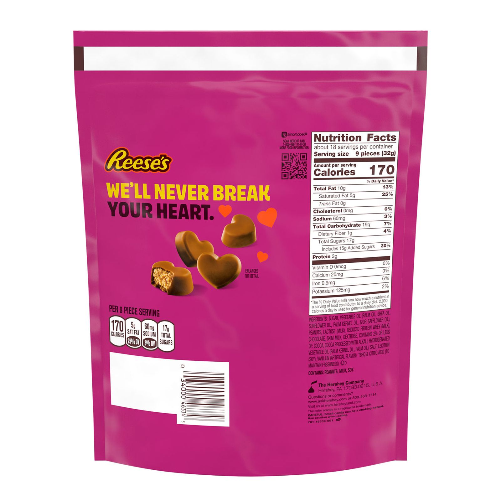 Make Valentine's Day gift-giving even more exciting with Reese's Unwrapped Chocolate Peanut Butter Creme Mini Hearts candies. Unwrapped for grab and go convenience in a resealable bag, these peanut butter creme mini hearts are best paired with a card and flowers to sweeten up any Valentine's Day celebration. Who wouldn't want to celebrate the holiday with scrumptious Reese's mini hearts filled with peanut butter creme and covered in chocolate candy? Give this festive pack to your family members, friends and colleagues to fill their day with a fun peanut butter creme treat. Just don't forget to keep a few for yourself, too! Hand out Reese's chocolate and peanut butter creme mini hearts during family movie nights, as an after-dinner dessert or as you enjoy an evening of baking festivities with your loved ones. Add Reese's heart-shaped treats to your favorite recipes to make delicious holiday peanut butter desserts. Stuff Reese's peanut butter creme mini hearts candies inside your favorite cookie dough, place a few on top of a yummy chocolate cake or add some to your ice cream sundae toppings bar. Reese's hearts candies are a decadent bite of peanut butter creme surrounded by smooth chocolate candy. A classic treat you can't beat, Valentine's Day wouldn't be the same without them!
