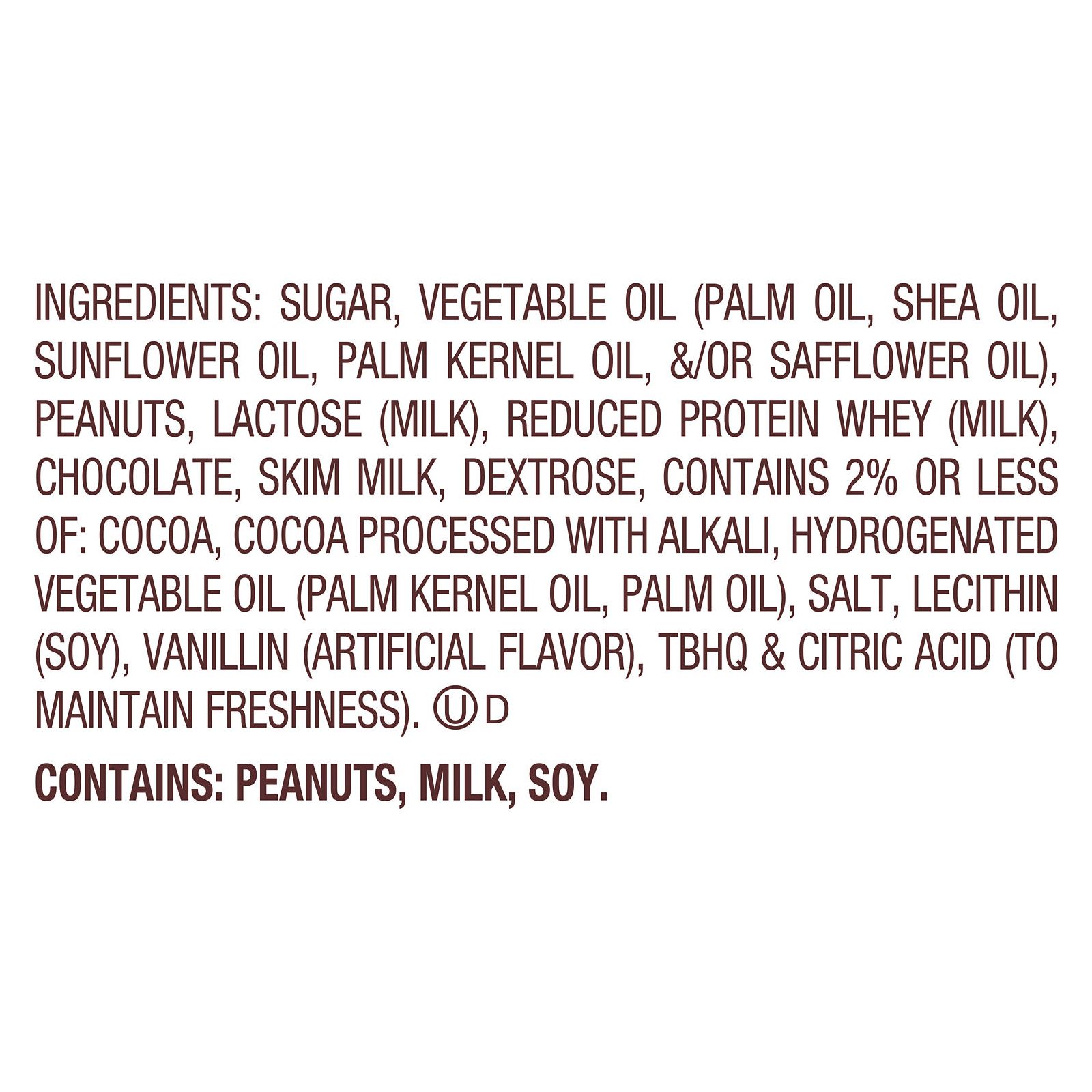 Ingredients: Sugar, Vegetable Oil (Palm Oil, Shea Oil, Sunflower Oil, Palm Kernel Oil, &/Or Safflower Oil), Peanuts, Lactose (Milk), Reduced Protein Whey (Milk), Chocolate, Skim Milk, Dextrose, Contains 2% Or Less Of: Cocoa, Cocoa Processed With Alkali, Hydrogenated Vegetable Oil (Palm Kernel Oil, Palm Oil), Salt, Lecithin (Soy), Vanillin (Artificial Flavor), Tbhq & Citric Acid (To Maintain Freshness).