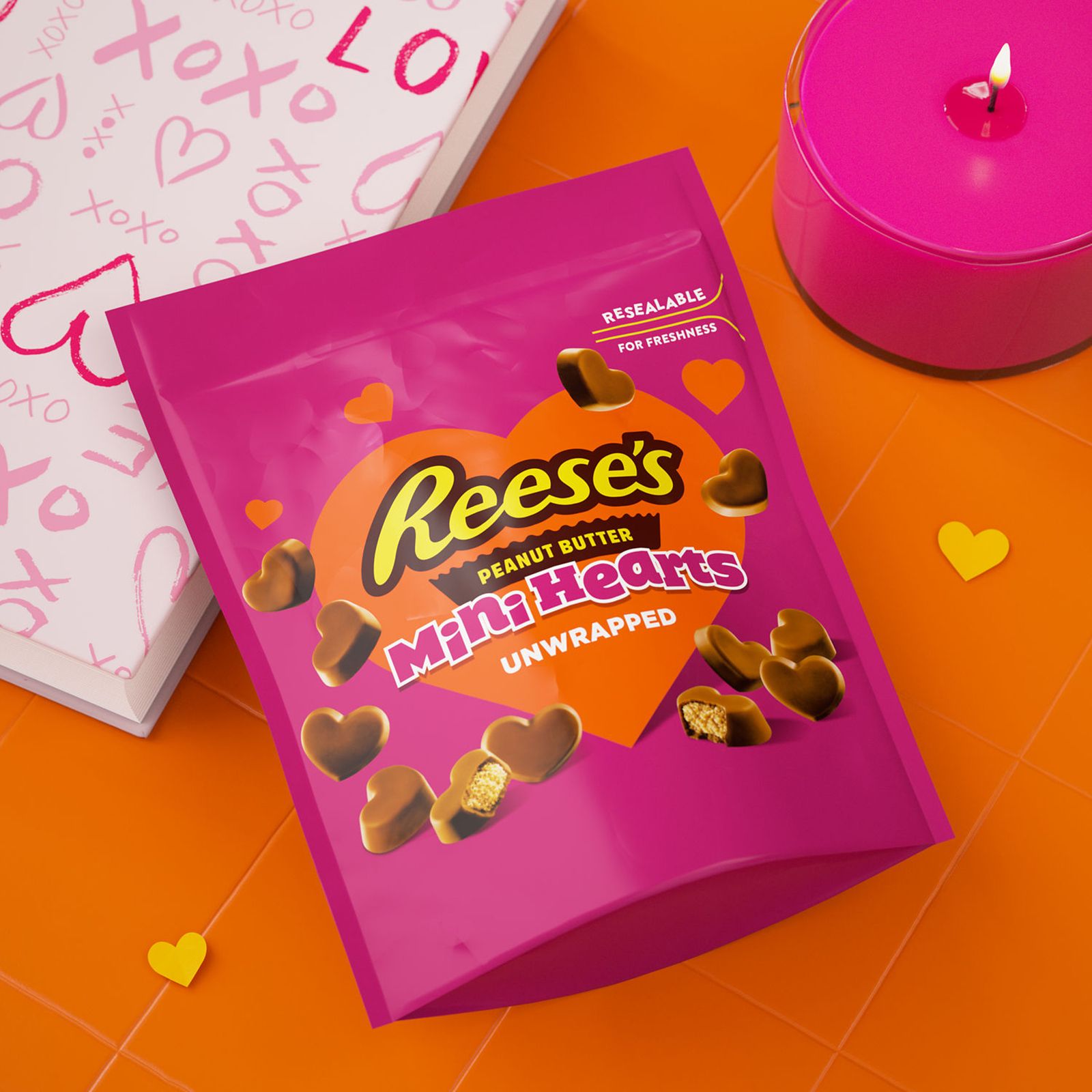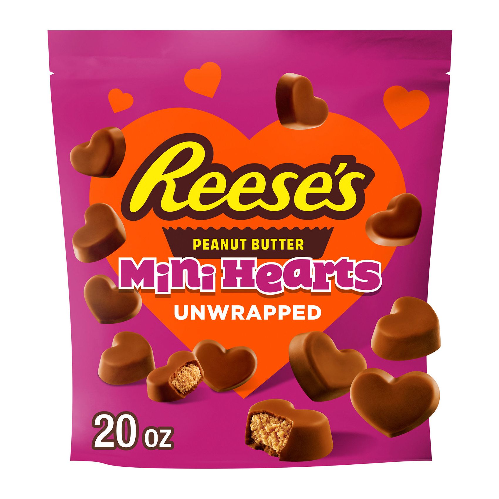 Includes one (1) 20-ounce bag of Reese's Unwrapped Chocolate Peanut Butter Creme Mini Hearts Candy