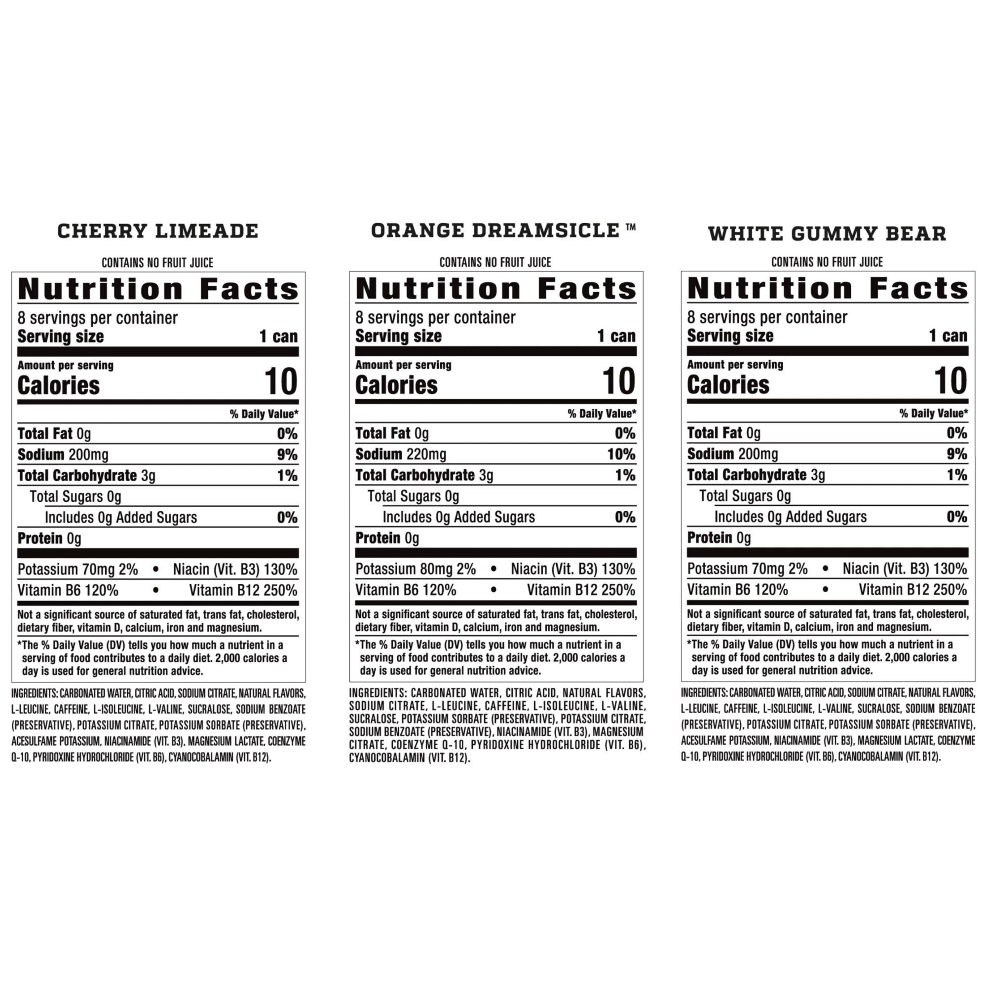 Ingredients:Carbonated Water, Citric Acid, Sodium Citrate, L-Leucine, Natural Flavors and Caffeine, L-Isoleucine, L-Valine, Potassium Sorbate (Preservative), Sodium Benzoate (Preservative), Niacinamide (Vit. B3), Magnesium Citrate, Co-Enzyme Q10, Pyridoxine Hydrochloride (Vit. B6), Cyanocobalamin (Vit B12).