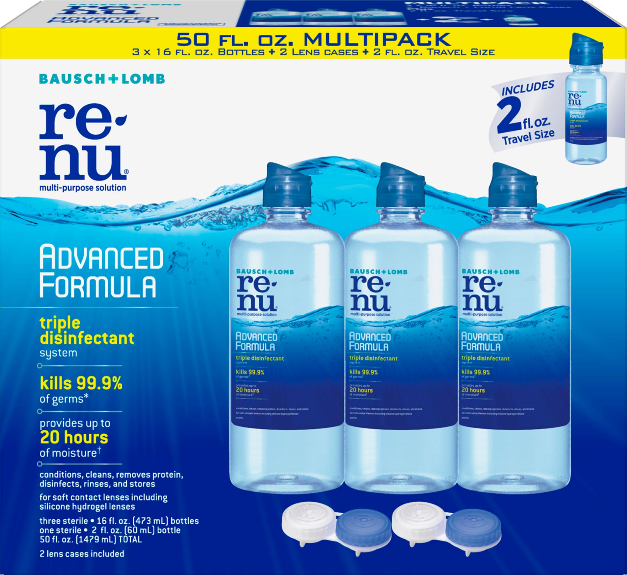 Triple disinfectant Kills 99.9% of germs Provides up to 20 hours of moisture Includes three pack of 16 fl. oz. advanced disinfectant for soft contact lenses
