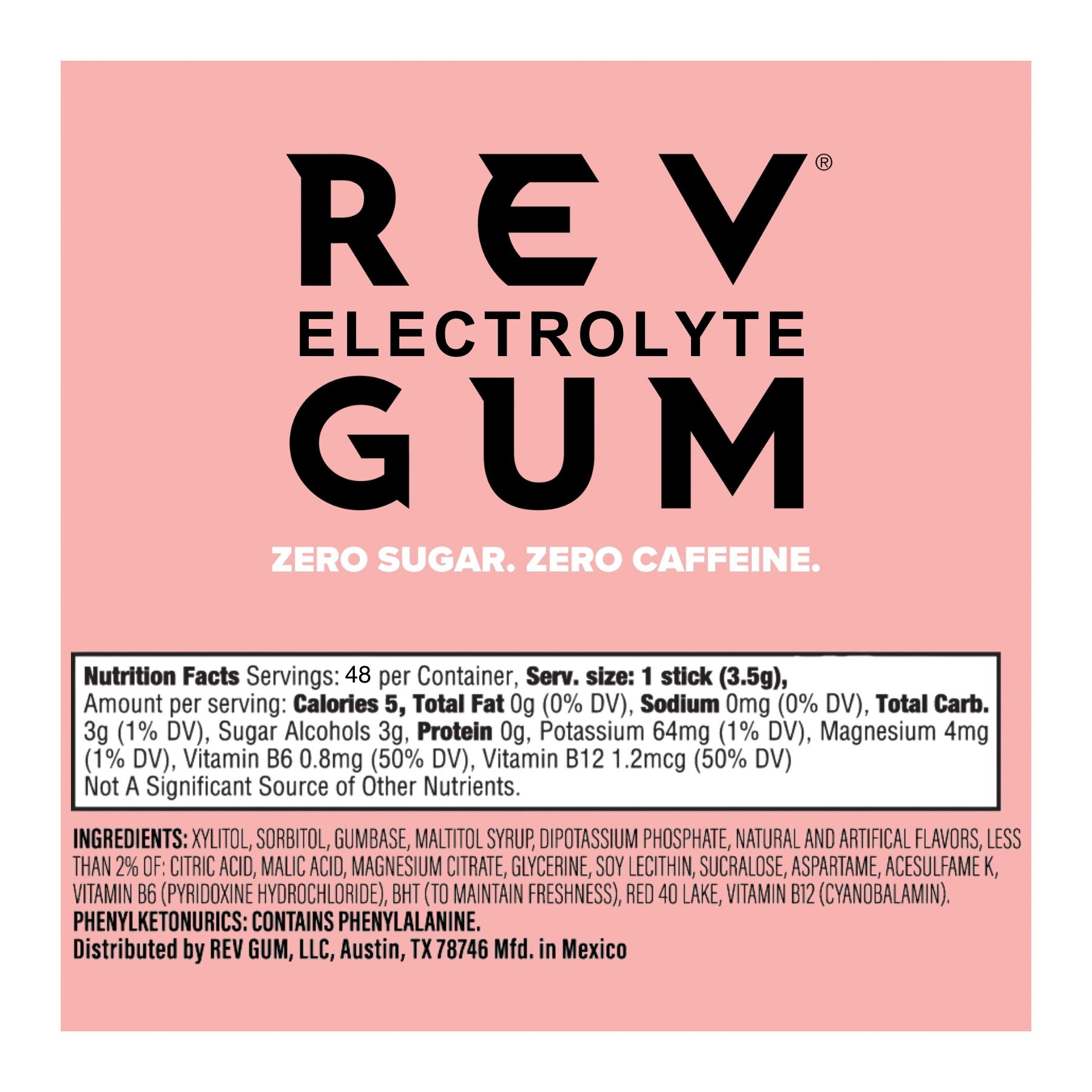 Hydration amplifying Rev Electrolyte Gum is packed with functional electrolytes like magnesium and potassium, alongside 50% DV of Vitamins B6 and B12 to support hydration and drive recovery. With a refreshing burst of Watermelon Lime flavor, Rev is both a performance and sensory experience like never seen from a gum item! Conveniently packaged to take on the go for all-day hydration boosting.