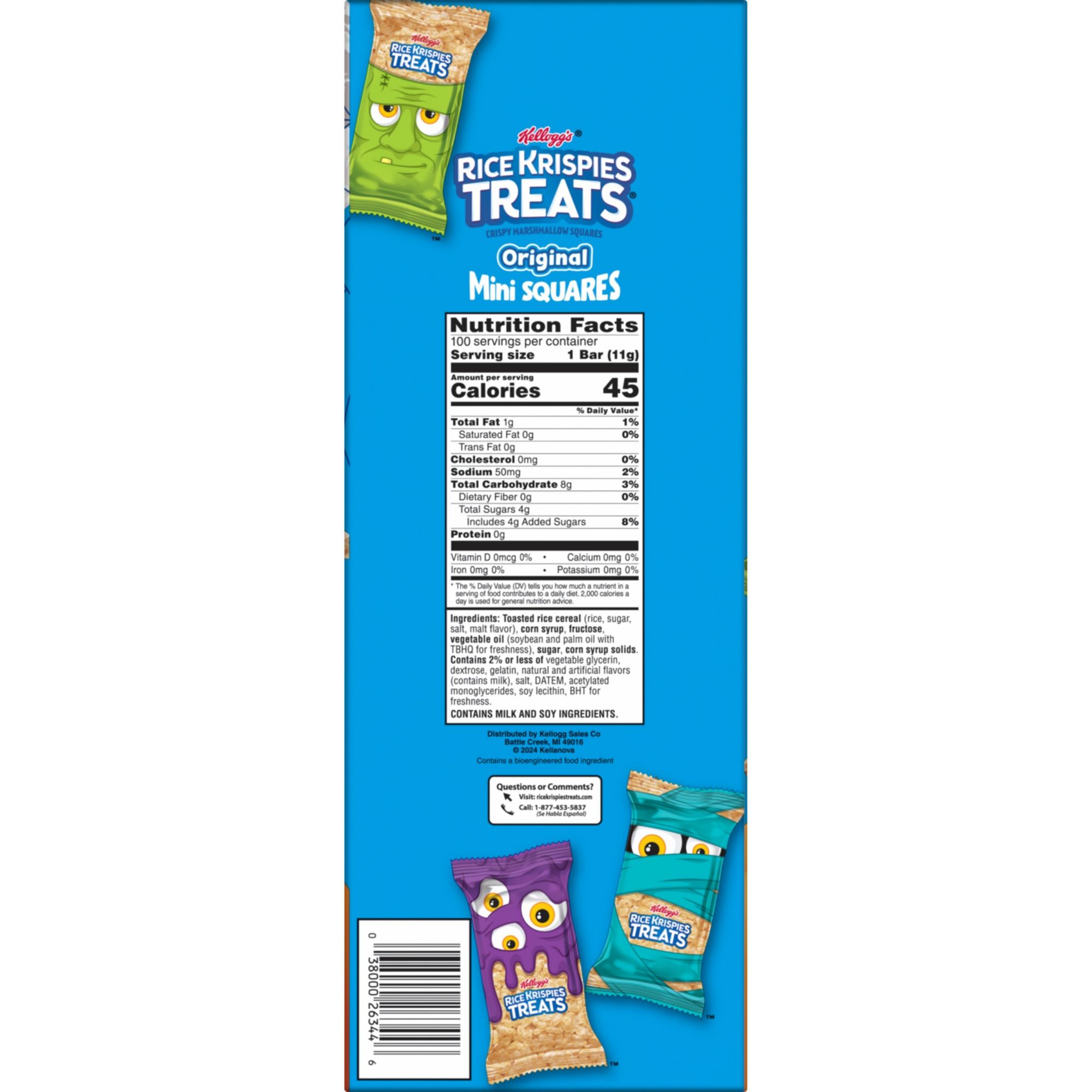 Make snack time a little sweeter and more fun with the irresistible taste of Rice Krispies Treats mini marshmallow snack bars. The delightful miniature-size and special, limited-time spooky packaging makes these Rice Krispies Treats perfect for passing out on Halloween, or just for a little extra fun to enjoy as the seasons turn. Each square is made with puffed rice cereal and the taste of chewy, gooey marshmallows for a delicious, ready-to-eat treat wherever you take it; A scrumptious snack any time of day, each individually wrapped package contains one bar that's perfect for Halloween class parties, the office, traveling, lunchtime, at the game, and more. Enjoy them by yourself or share with friends and family, Rice Krispies Treats mini marshmallow snack bars make great fillers for trunk or treat parties, gift baskets, or care packages. Satisfy your sweet craving with the simple goodness and on-the-go convenience of Rice Krispies Treats mini marshmallow snack bars.