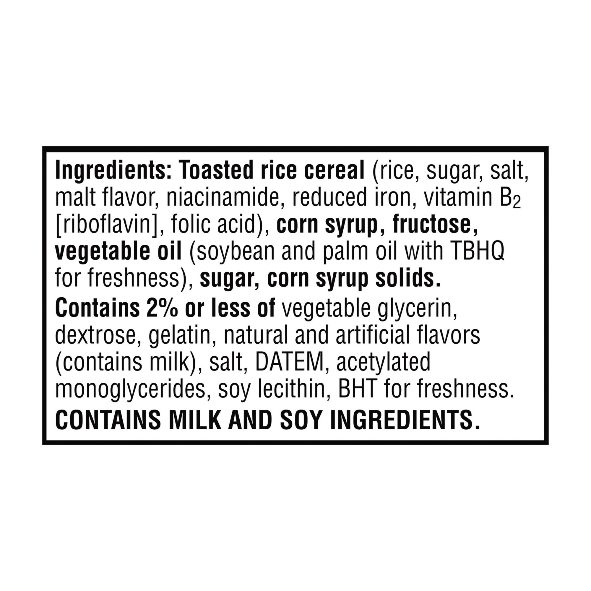 Ingredients Toasted Rice Cereal (Rice, Sugar, Salt, Malt Flavor), Corn Syrup, Fructose, Vegetable Oil (Soybean And Palm Oil With Tbhq For Freshness), Sugar, Corn Syrup Solids. Contains 2% Or Less Of Vegetable Glycerin, Dextrose, Gelatin, Natural And Artificial Flavors (Contains Milk), Salt, Datem, Acetylated Monoglycerides, Soy Lecithin, Bht For Freshness.