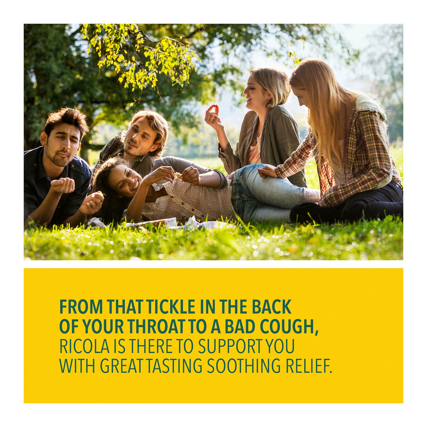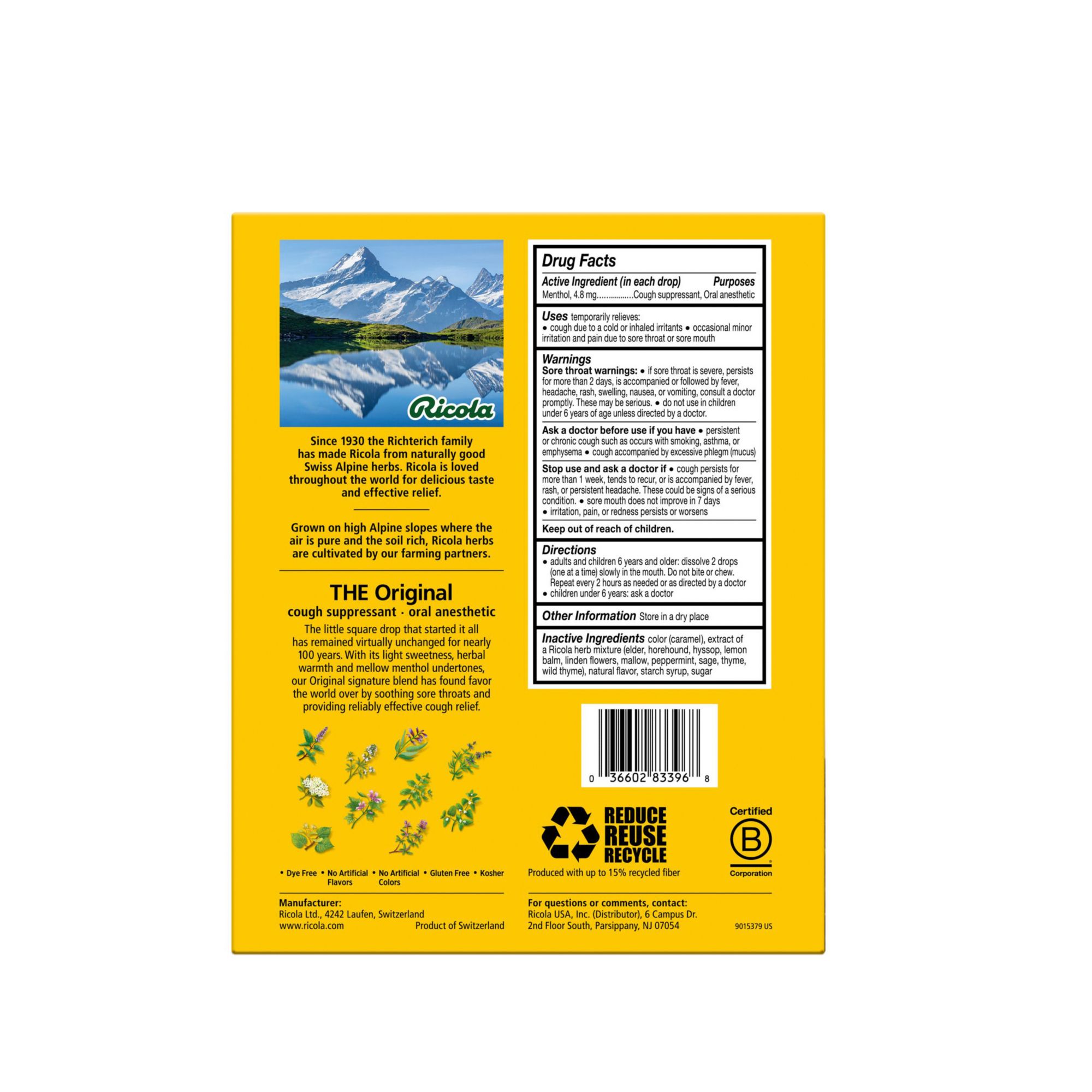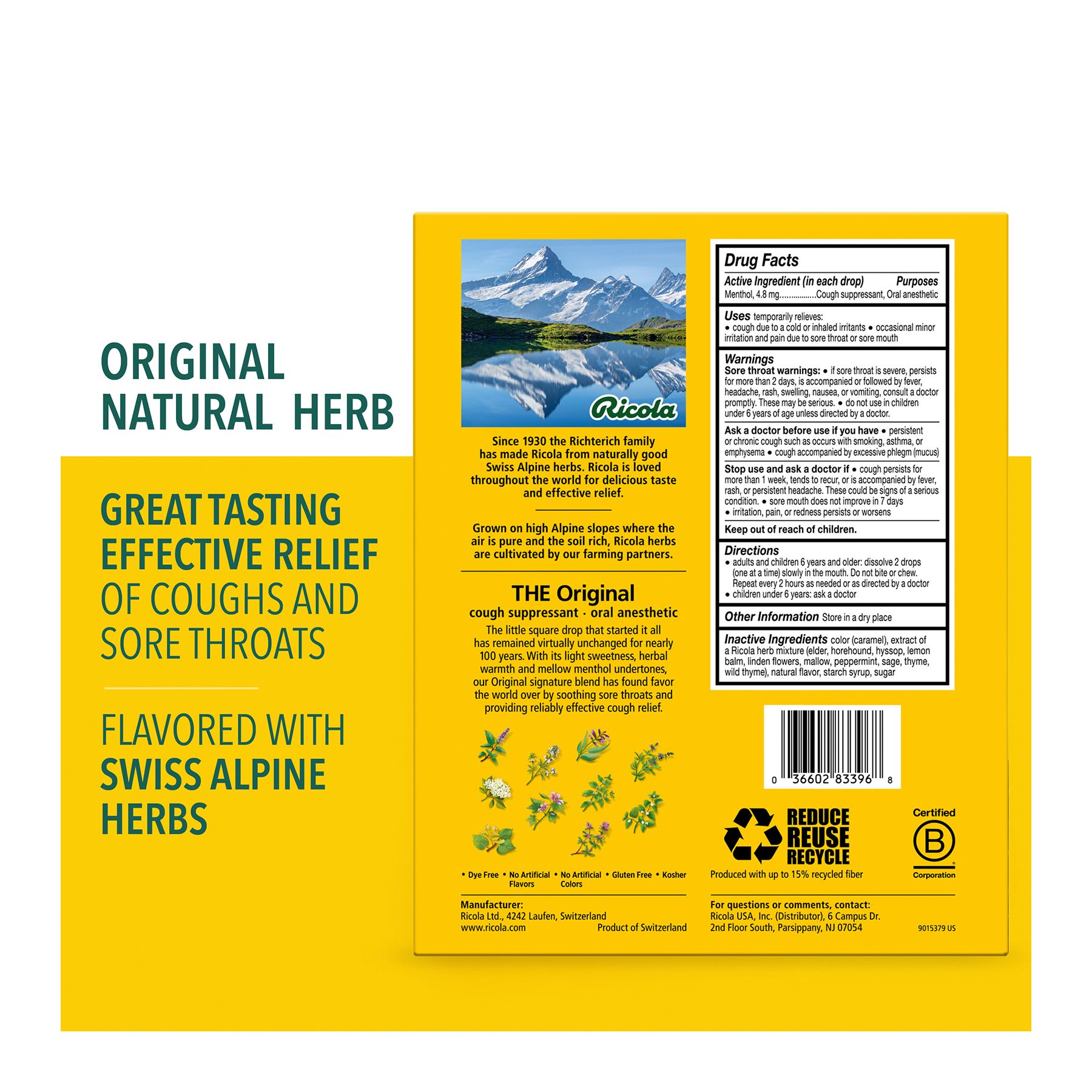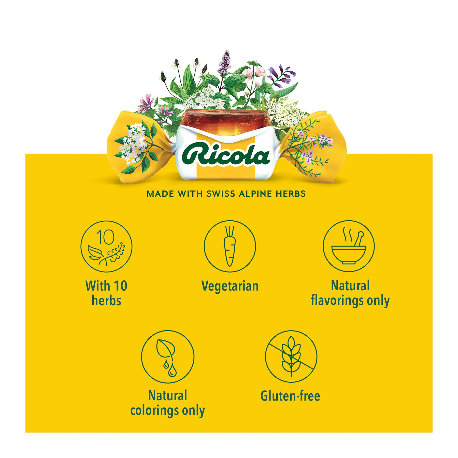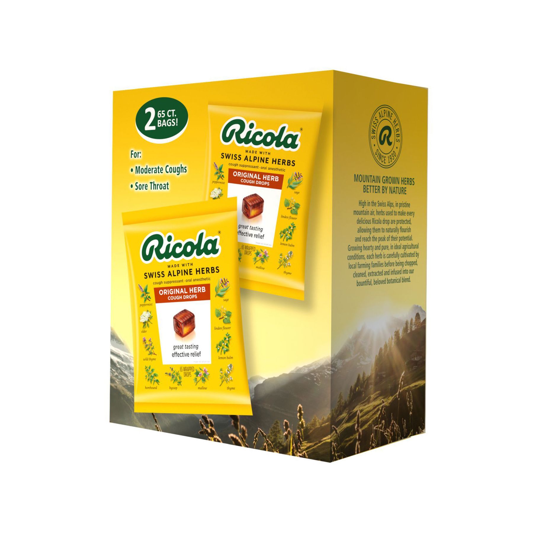 For nearly a century, Ricola has been helping throats feel better naturally. Using high-quality herbs grown high in the Swiss mountains to make their world famous herb cough drop. Along with its pleasing herbal taste and unique square shape, it provides you soothing relief from coughs due to colds or flus. And today, it can also help with itchy throats from allergies. Or with daily voice care for dry and hoarse throats.