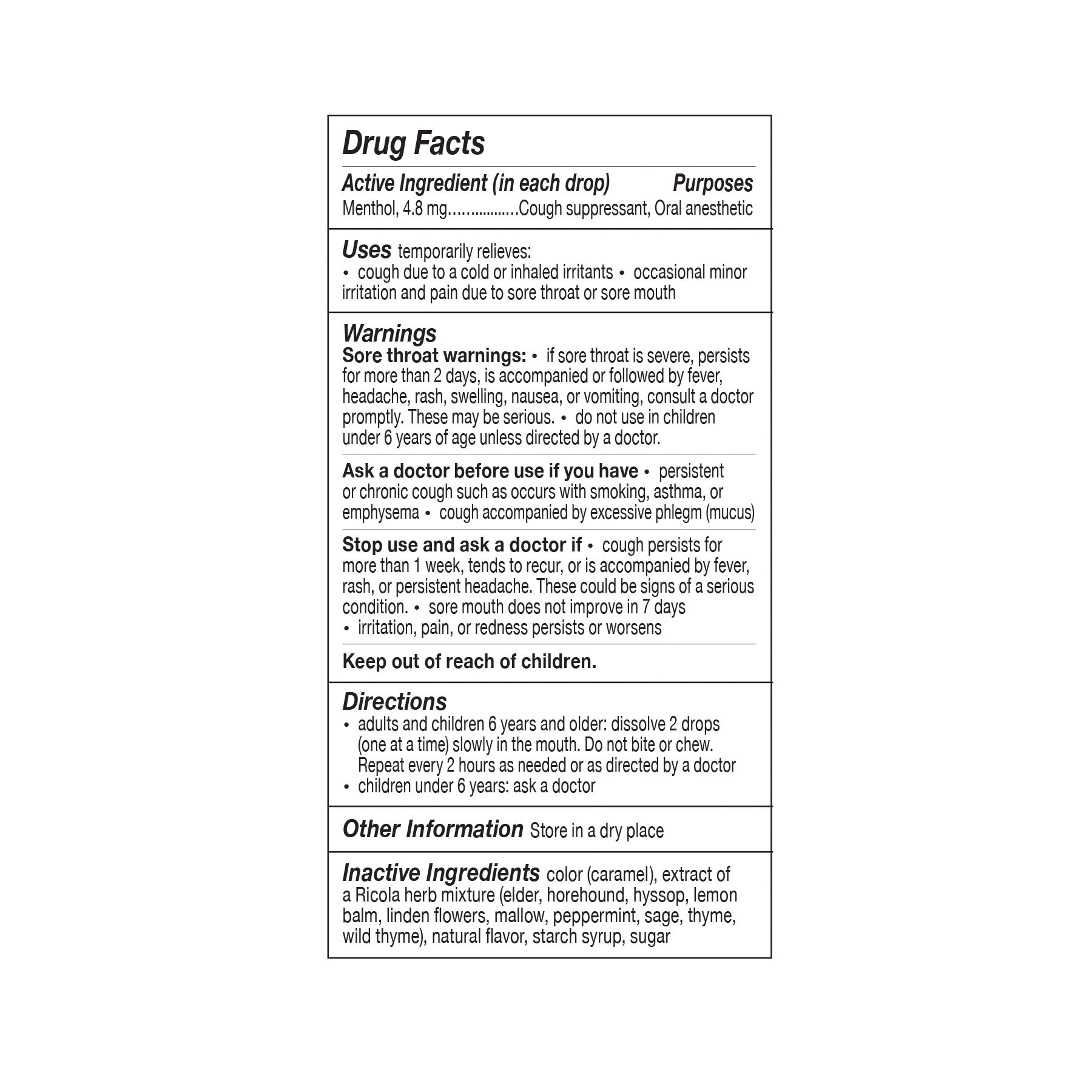 Instructions For Use Adults and children 6 years and older: dissolve 2 drops (one at a time) slowly in the mouth. Do not bite or chew. Repeat every 2 hours as needed or as directed by a doctor. Children under 6 years: ask a doctor.