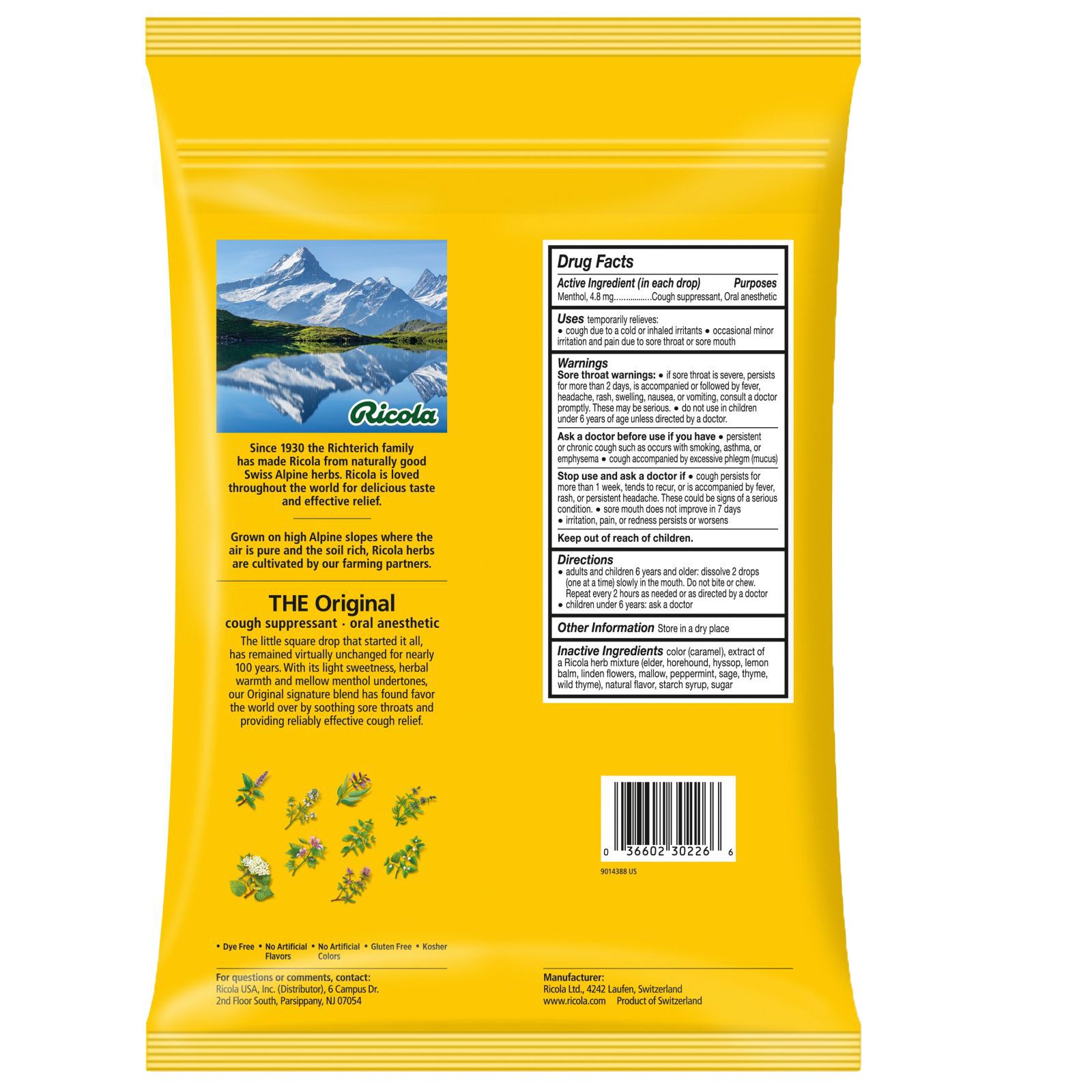 For nearly a century, Ricola has been helping throats feel better naturally using only high-quality herbs grown high in the Swiss mountains to make their world famous herb cough drop. Along with its pleasing herbal taste and unique square shape, Ricola Original Natural Herb Cough Drops provide soothing relief from coughs due to colds or flus. They also help with itchy throats from allergies, or with daily voice care for dry and hoarse throats.
