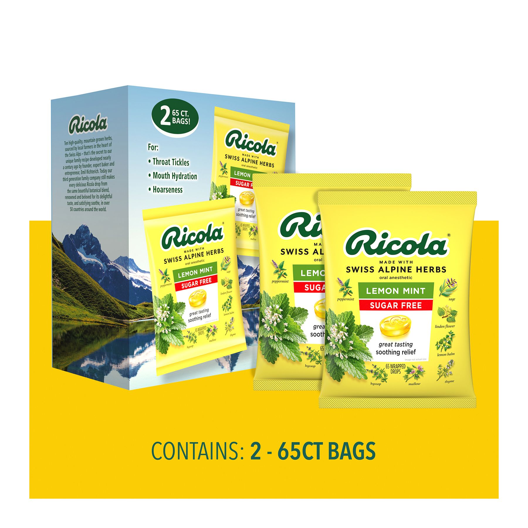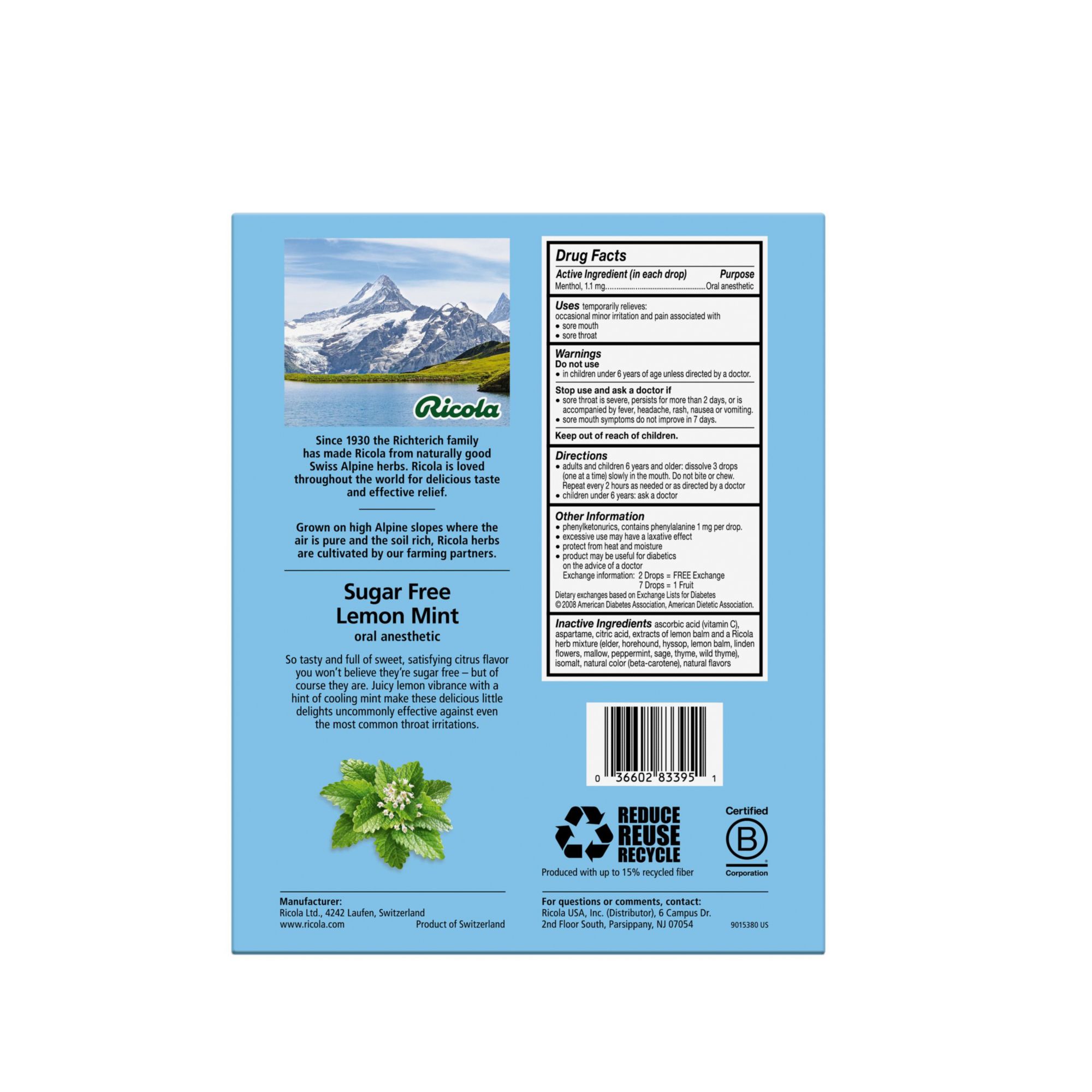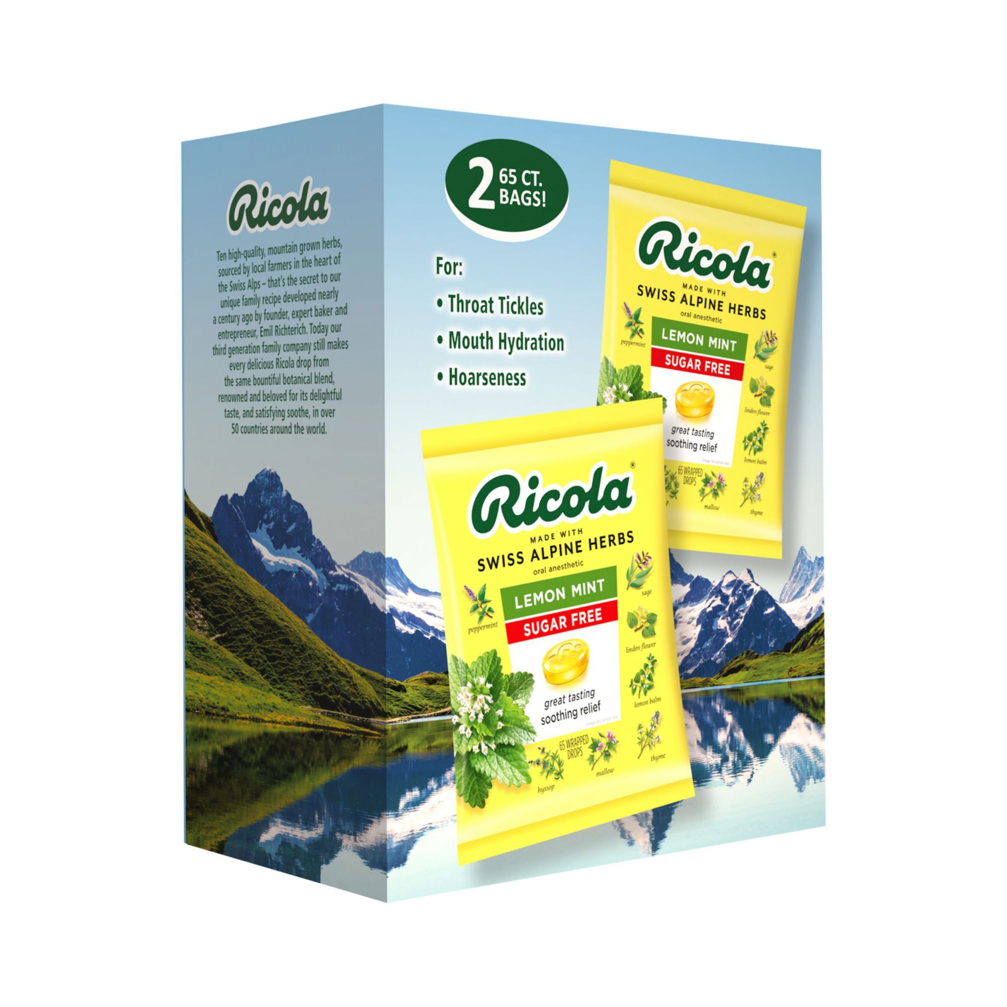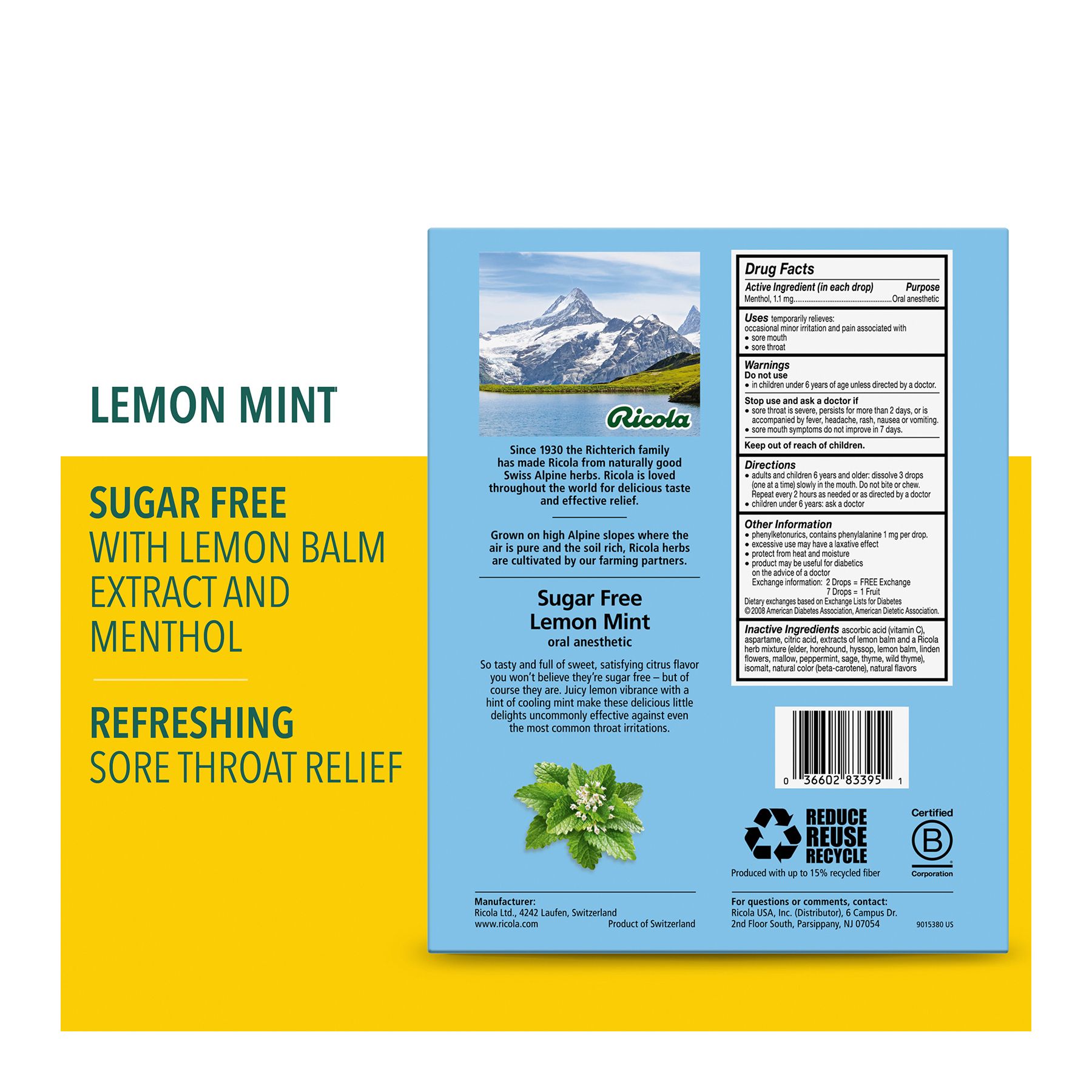 Get soothing relief for sore throats with the fresh lemony taste of Ricola Lemon Mint. It combines natural lemon balm extract with menthol sourced from real peppermint leaves. Plus Ricola's unique blend of mountain grown Swiss herbs. Ricola Sugar Free Lemon Mint is a refreshing answer to most any throat irritation.