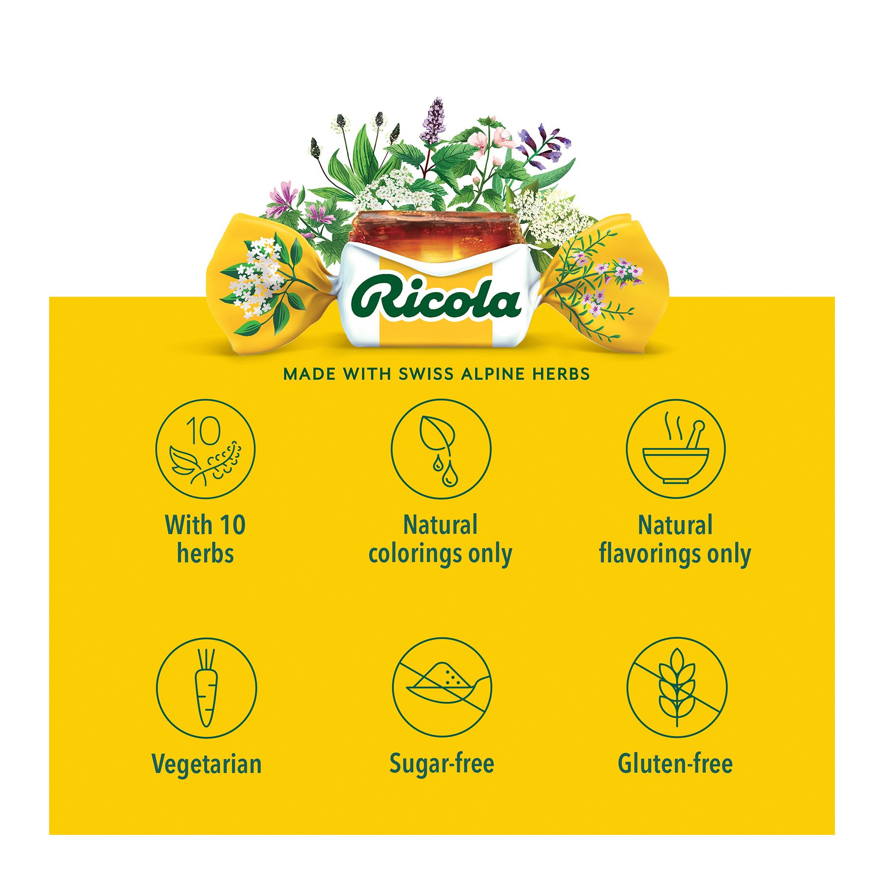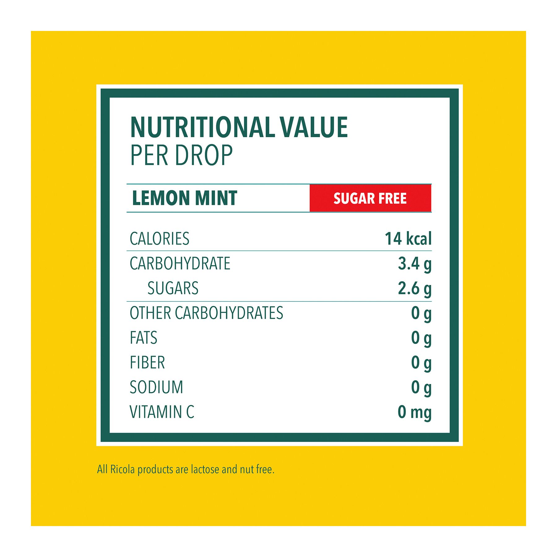 Ingredients: Menthol, Ascorbic Acid (Vitamin C), Aspartame, Citric Acid, Extract Of Lemon Balm And A Ricola Herb Mixture (Elder, Horehound, Hyssop, Lemon Balm, Linden Flowers, Mallow, Peppermint, Sage, Thyme, Wild Thyme), Isomalt, Natural Color (Beta-carotene), Natural Flavors.