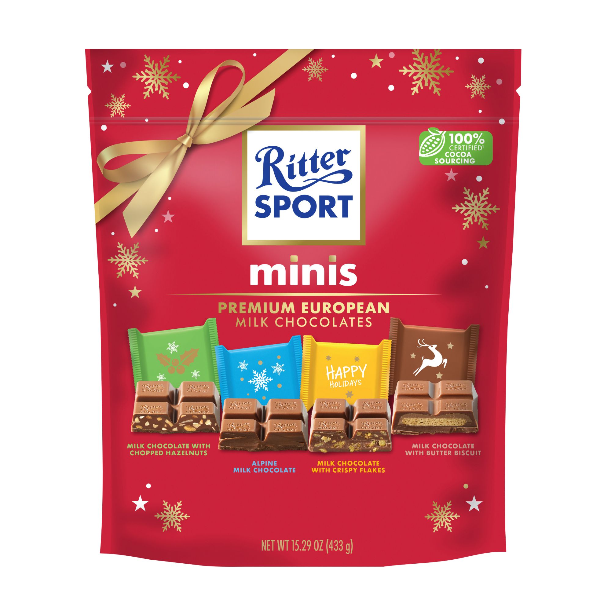 Ritter Sport Assorted Chocolates, including dark chocolate whole hazelnut, crispy flakes, biscuit and alpine milk.