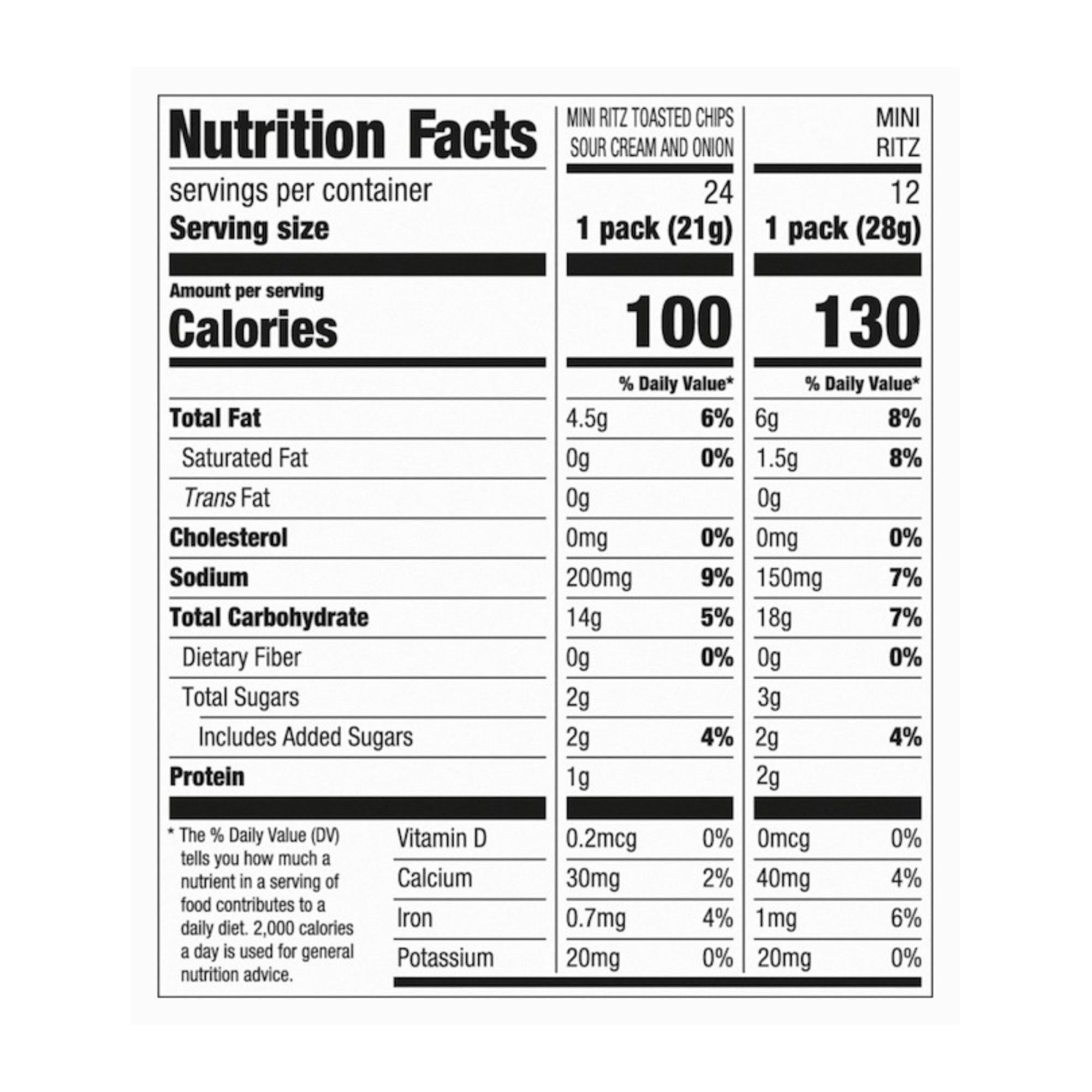 Perfect crackers for snacking, appetizers or quick meals Pairs with almost any topping, from meat and cheese to fruit and whipped cream Ritz Mini Toasted Chips are a crispy, crunchy bite-size twist on the classic cracker you know and love Sour Cream and Onion flavor Ritz Mini Toasted Chips are a wholesome snacking choice that's made with 40% less fat than leading regular fried potato chips (6 grams of fat per serving vs. 10 grams)