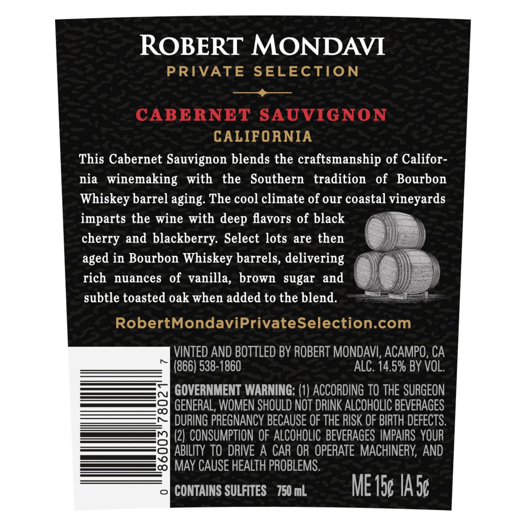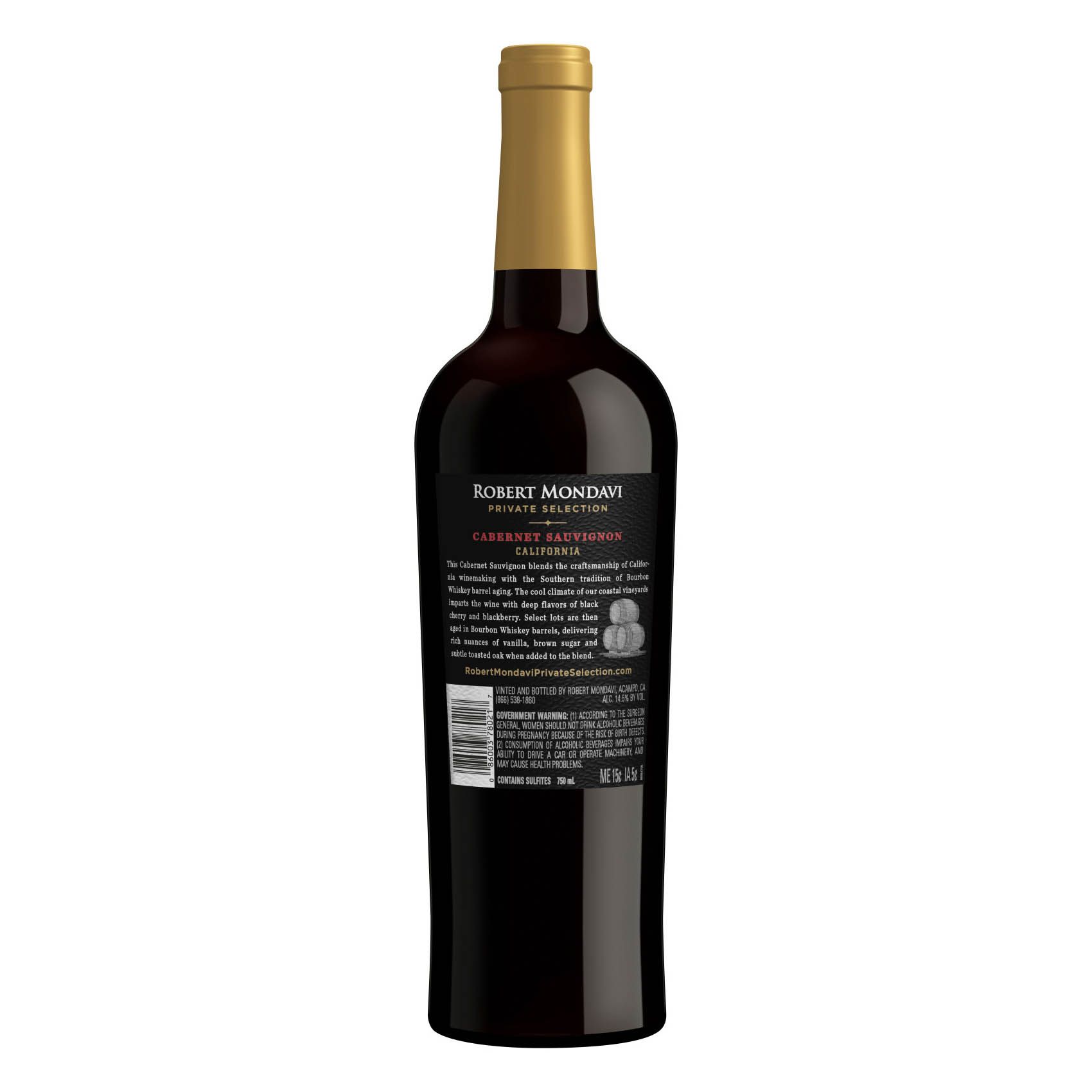 One 750ml bottle of Robert Mondavi Private Selection Bourbon Barrel Aged Cabernet Sauvignon Red Wine, containing five 5 fl. oz. glasses of wine Cabernet Sauvignon wine with aromas of ripe, dark mixed berries, blackberry cobbler, graham cracker, and toasty oak Pair this rich-tasting wine with bourbon-glazed grilled meats or a hearty pasta dish California wine crafted with grapes sourced from prime vineyards American oak barrel aged wine with rich, complex flavors Robert Mondavi Private Selection: A legacy of classic California wines Includes one 750ml bottle of Robert Mondavi Private Selection Bourbon Barrel Aged Cabernet Sauvignon Red Wine, containing five 5 fl. oz. glasses of wine