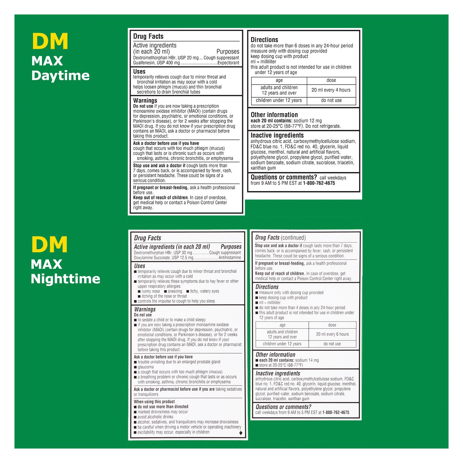 Active Ingredients: Day (In each 20mL) Dextromethorphan HBr, USP 20mg Cough suppressant - Guaifenesin, USP 400mg Expectorant. Night (In each 20mL) Dextromethorphan HBr, USP 30mg Cough suppressant Doxylamine Succinate, USP 12.5mg Antihistamine.