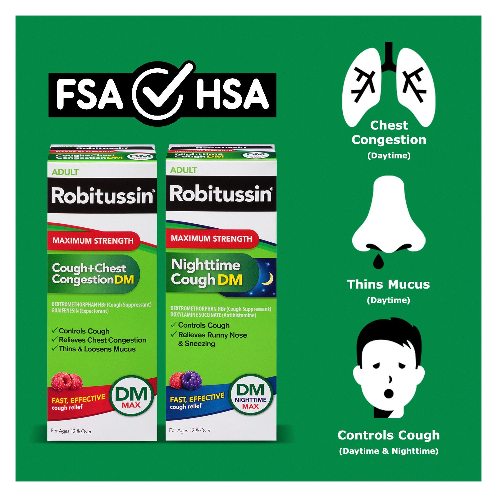 Get fast, powerful cough relief with Robitussin DM Max Cough Plus Chest Congestion daytime formula and nighttime formula. This is the cough medicine for adults if your cough and cold symptoms are keeping you down during the day and up at night. Non-drowsy Robitussin Cough Plus Chest Congestion controls cough and delivers chest congestion relief with a powerful cough suppressant and expectorant. At night, Robitussin Nighttime Cough contains an antihistamine that relieves runny nose and sneezing while a cough suppressant controls your cough so you can sleep. Suitable for adults and children ages 12 and over, daytime Robitussin DM maximum strength cough medicine may be taken in 20 mL doses every four hours and nighttime Robitussin DM may be taken in 20 mL doses every six hours. Delivering trusted and effective cough relief for more than 75 years, Robitussin has the product you need to treat your specific cough, cold, sore throat or flu symptoms for day and night relief. Robitussin shuts coughs down.