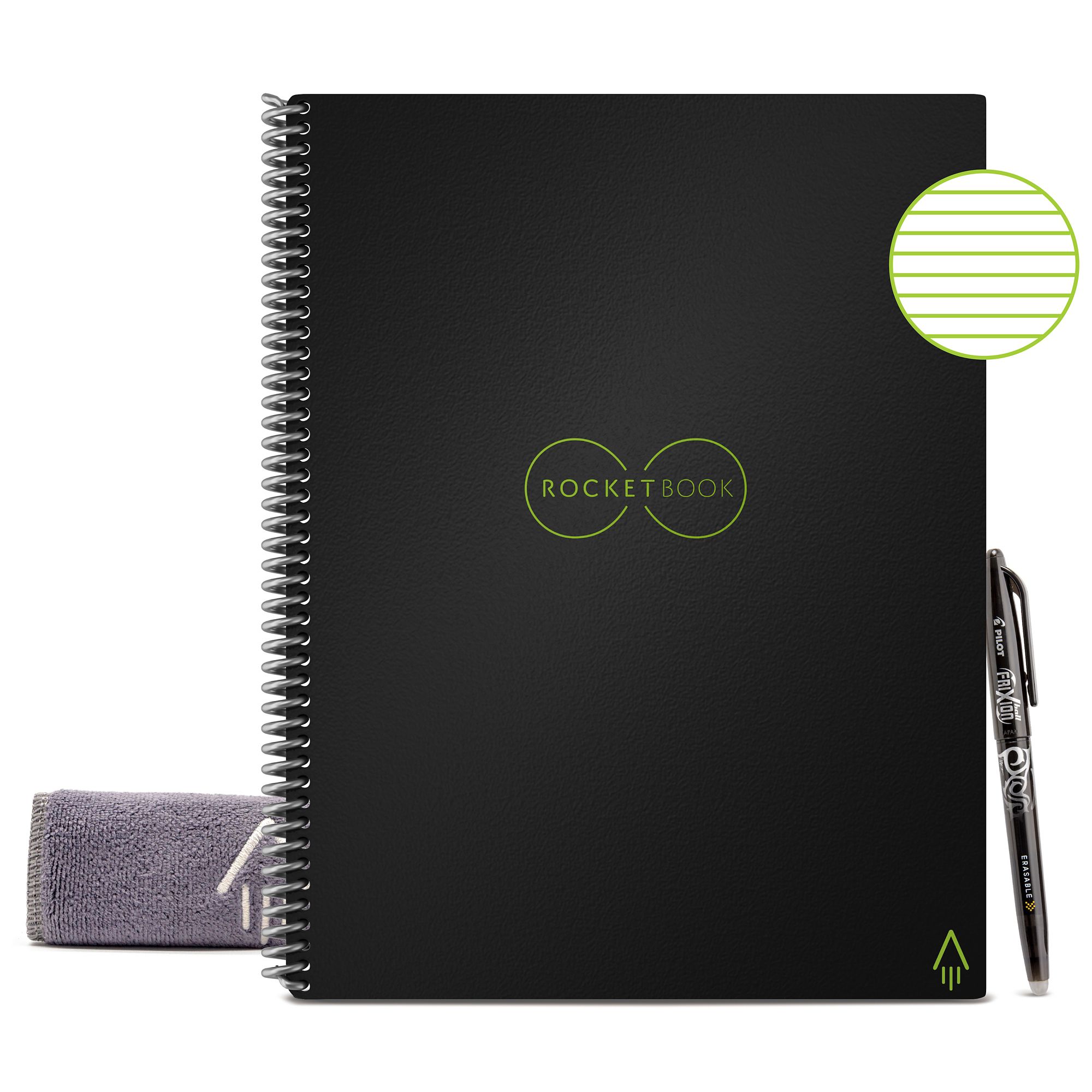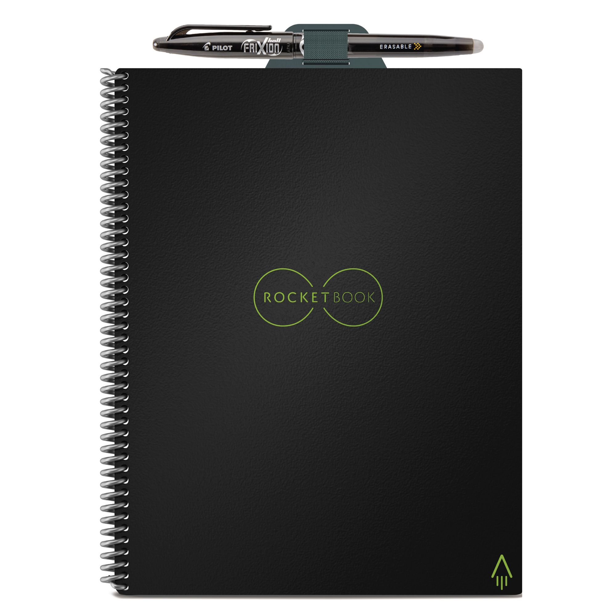 Includes one rocketbook core letter size (8.5" x 11") notebook, one pilot frixion pen, one microfiber cloth, one pen station