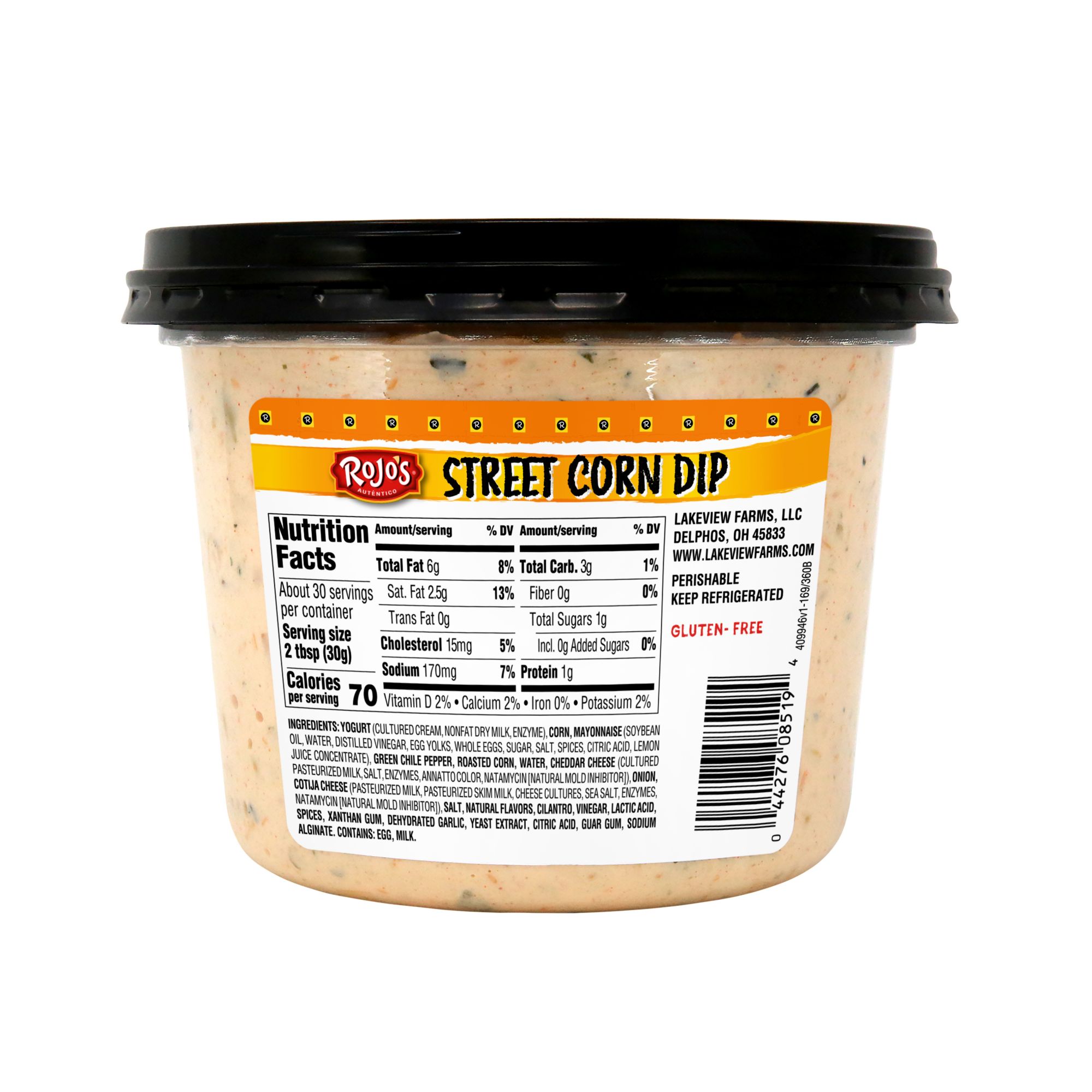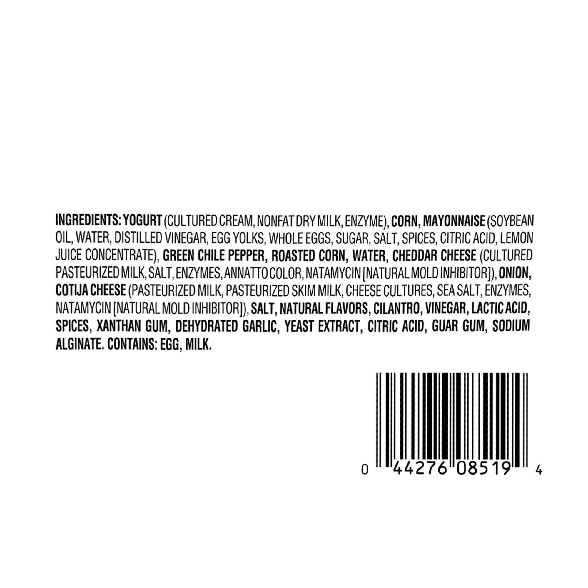 Ingredients:Yogurt (Cultured Cream, Nonfat Dry Milk, Enzyme), Corn, Mayonnaise (Soybean Oil, Water, Distilled Vinegar, Egg Yolks, Whole Eggs, Sugar, Salt, Spices, Citric Acid, Lemon Juice Concentrate), Green Chile Pepper, Roasted Corn, Water, Cheddar Cheese (Cultured Pasteurized Milk, Salt, Enzymes, Annatto Color, Natamycin [natural Mold Inhibitor]), Onion, Cotija Cheese (Pasteurized Milk, Pasteurized Skim Milk, Cheese Cultures, Sea Salt, Enzymes, Natamycin [natural Mold Inhibitor]), Salt, Natural Flavors, Cilantro, Vinegar, Lactic Acid, Spices, Xanthan Gum, Dehydrated Garlic, Yeast Extract, Citric Acid, Guar Gum, Sodium Alginate.
