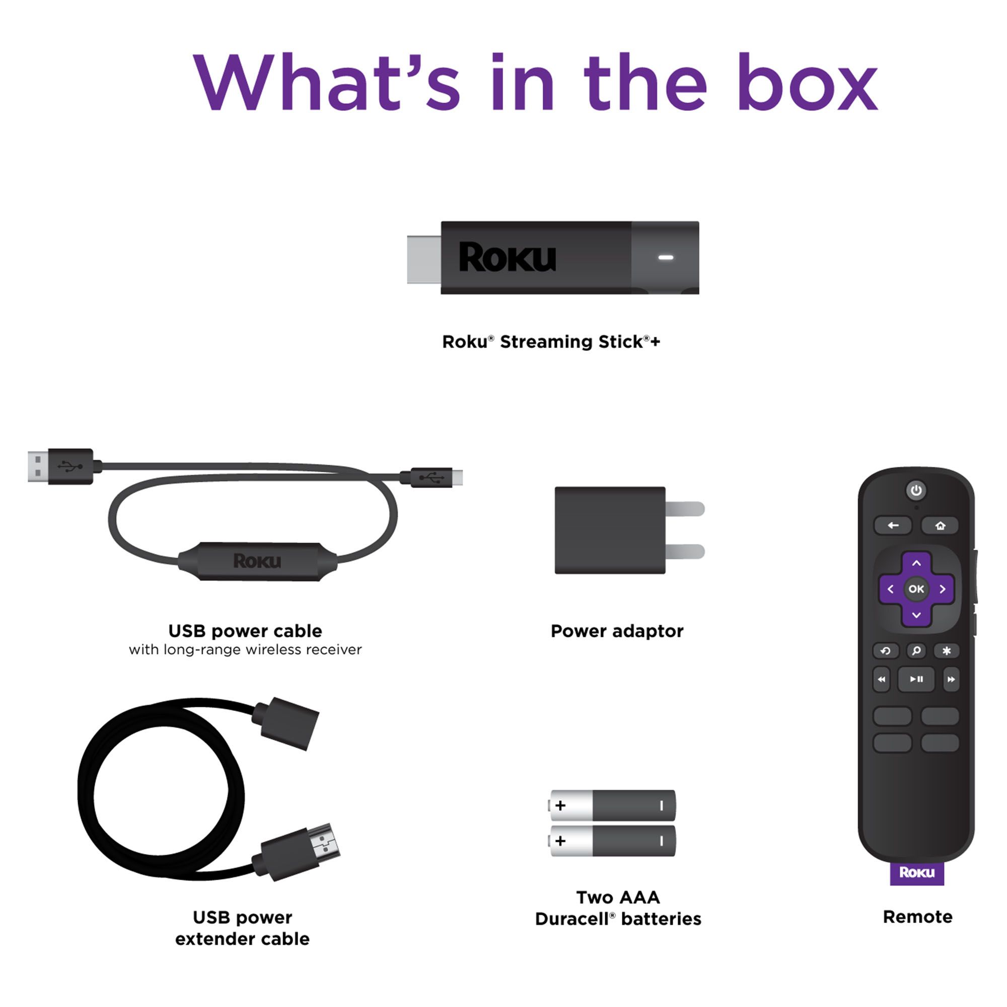 Long-range wireless allows you to stream in rooms farther from your router with up to 4x the wireless range and a stronger signal Enjoy streaming in HD, 4K, and HDR with sharp resolution and vivid color Voice remote with TV controls allows you to power up your TV, adjust the volume, mute, search with your voice, and more with one remote Free Roku mobile app to control your player or Roku TV, use voice search, enjoy private listening, and more on iOS and Android Enjoy smooth HD, 4K, and HDR streaming Move it around your home or use while traveling Great for wall-mounted TVs, as the Roku Streaming Stick Plus and its power cord plug into the back of your TV for a clutter-free setup Stream just about anything, including free TV, live news, sports, and more Stream live TV, 24/7 news, sports, movies, shows, and more on The Roku Channel, plus a huge collection of free entertainment from top channels on Featured Free Search across top channels by searching title, actor, director, or genre to see where you can stream shows for free or at the lowest cost Includes Roku Streaming Stick Plus, Wi-Fi remote control, 2/AAA batteries, power adapter, USB power cable with advanced wireless receiver, and user guide Warranty: 1 year limited